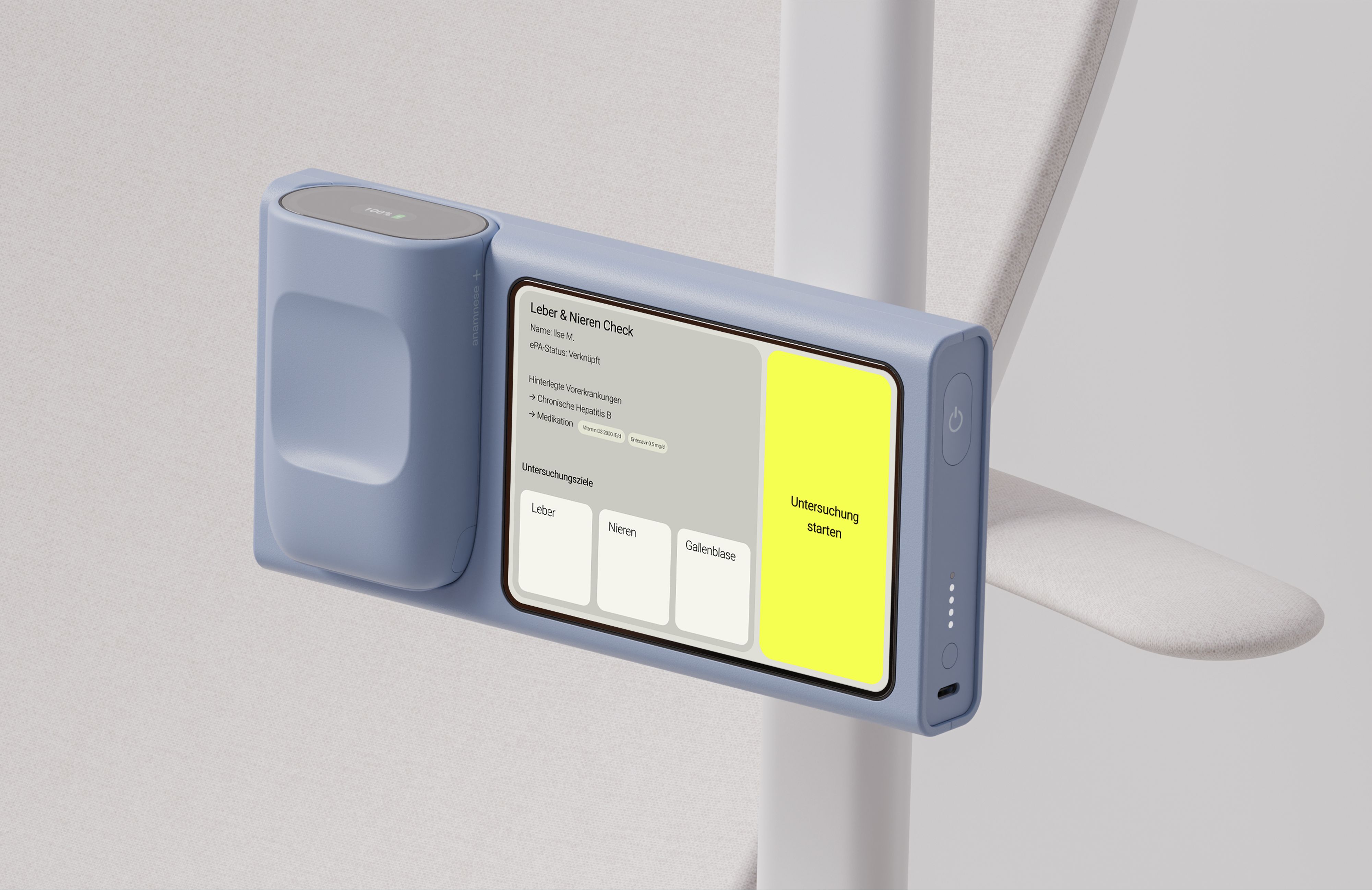 From a UX perspective, the challenge was to redesign the entire examination workflow from scratch. Current ultrasound procedures are based on expert interpretation of complex images. I first gained a deep understanding of these processes through an ultrasound course, field research and expert interviews to identify which elements could be rethought. The key was to move away from expert-centred interaction by simplifying data acquisition, minimizing information complexity, and guiding non-expert users through real-time scan quality feedback. Designing these workflows required intensive prototyping of scenarios, physical setups, and user interfaces, while keeping the experience simple and intuitive for non-specialist users.