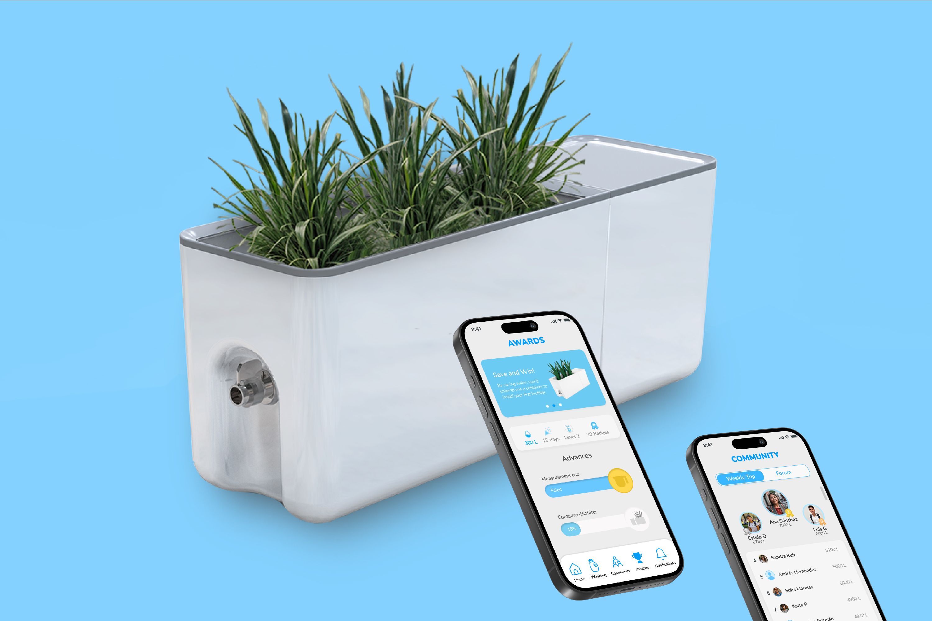 The UX challenge was creating a solution that goes beyond providing sustainable tech—it had to connect with users of different awareness, interest, and context. Research revealed that barriers were behavioral, emotional, and structural. How do we motivate someone who's never considered reusing greywater? How do we make it intuitive and adaptable across lifestyles and spaces? That led to designing a modular biofilter as part of a product-service ecosystem. But it wasn't just about the object—it became a catalyst for learning and habit formation. Through challenges, rewards, and a personalized journey, the system invites users into sustainability not through obligation, but empowerment.
