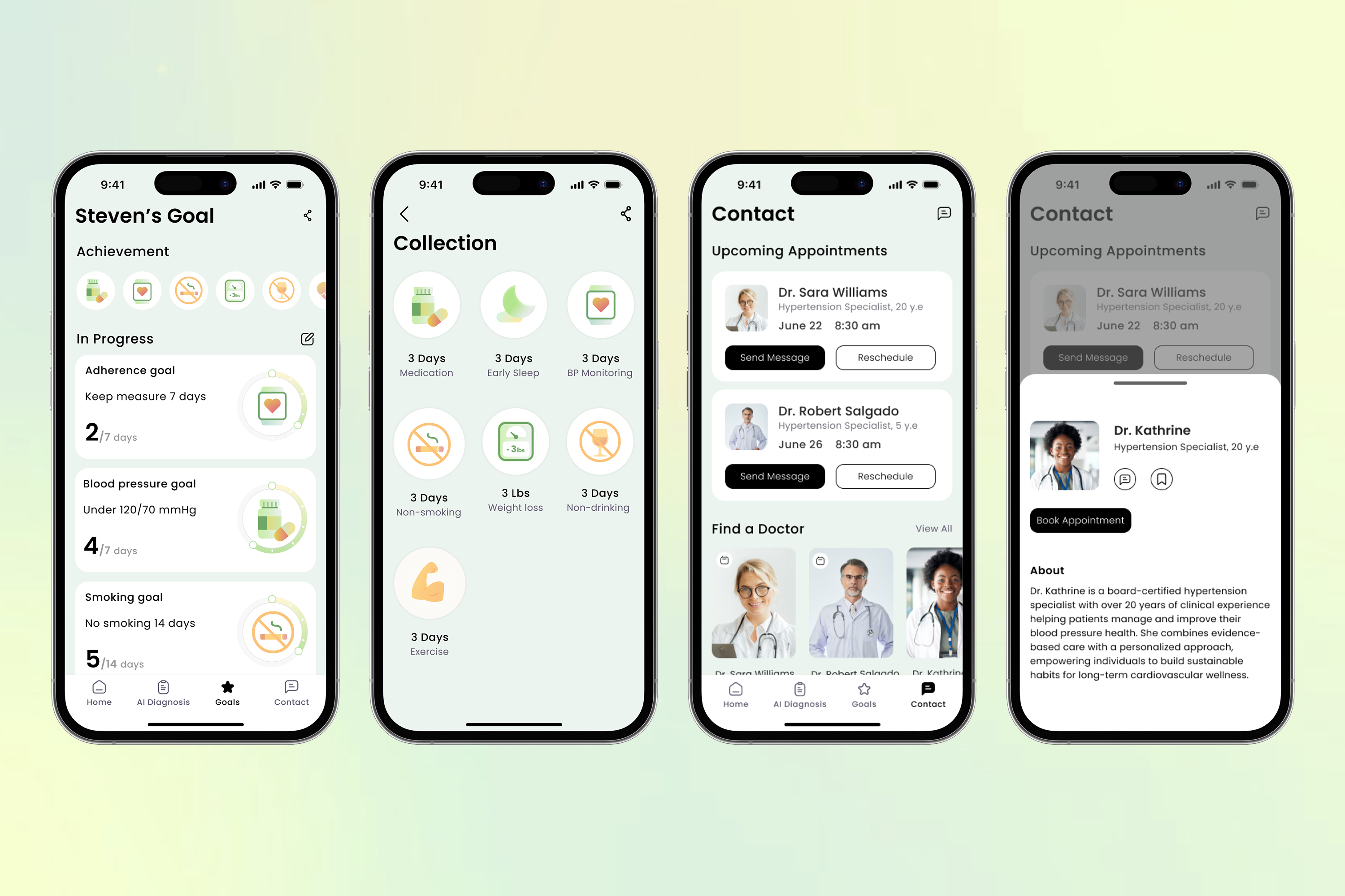 This insight led us to refine features like AI tips and diagnosis that offer encouragement and simulate a clinic-like experience, as well as simple goal-setting tools to keep users motivated. Every detail was designed to feel approachable, supportive, and easy to use—especially for those managing a chronic condition day to day.