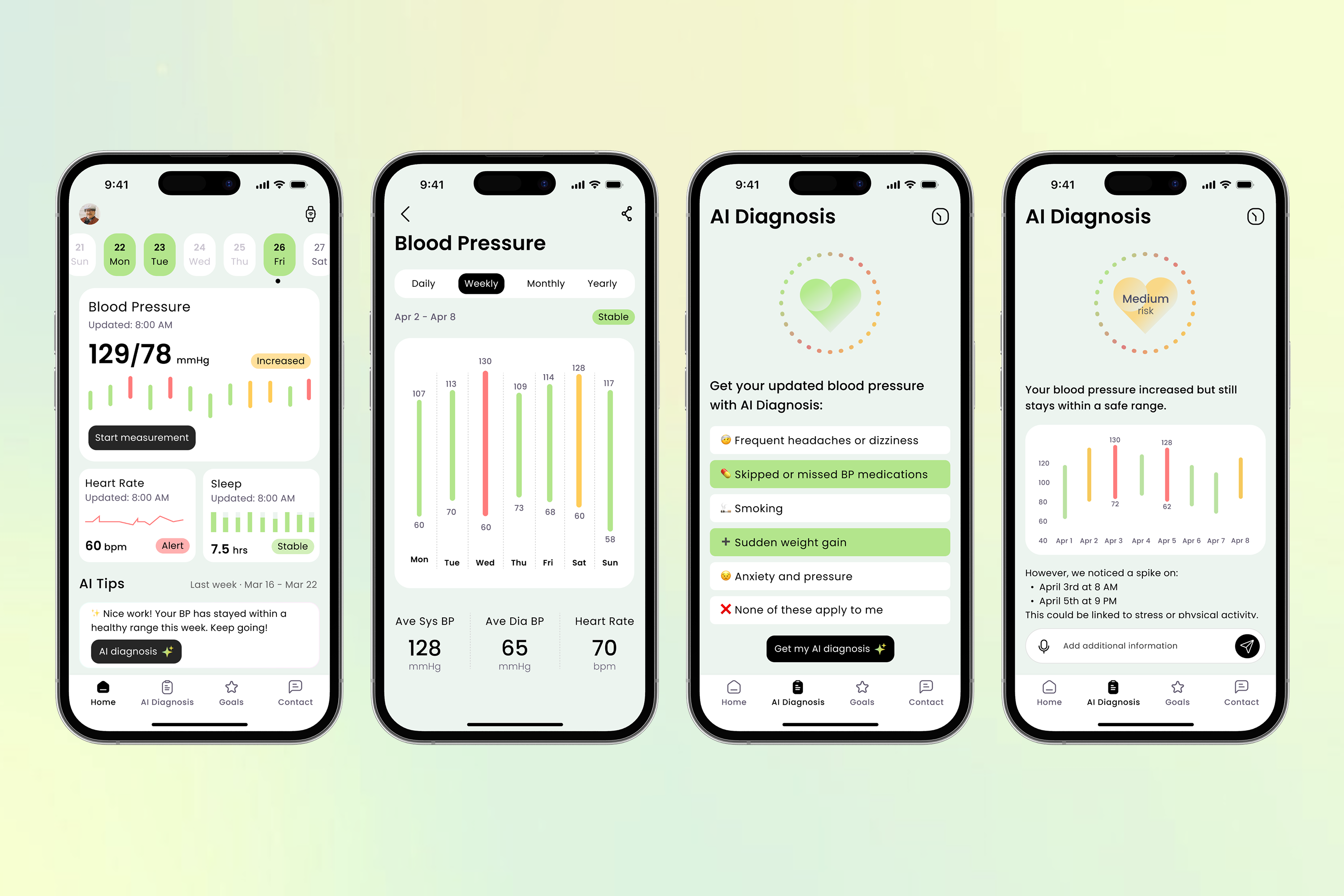 Through interviews with doctors and patients, we learned that managing hypertension goes beyond tracking—it requires sustained behavior change. However, many patients don’t fully understand their readings or receive timely feedback, especially when experiencing symptoms or abnormal spikes.