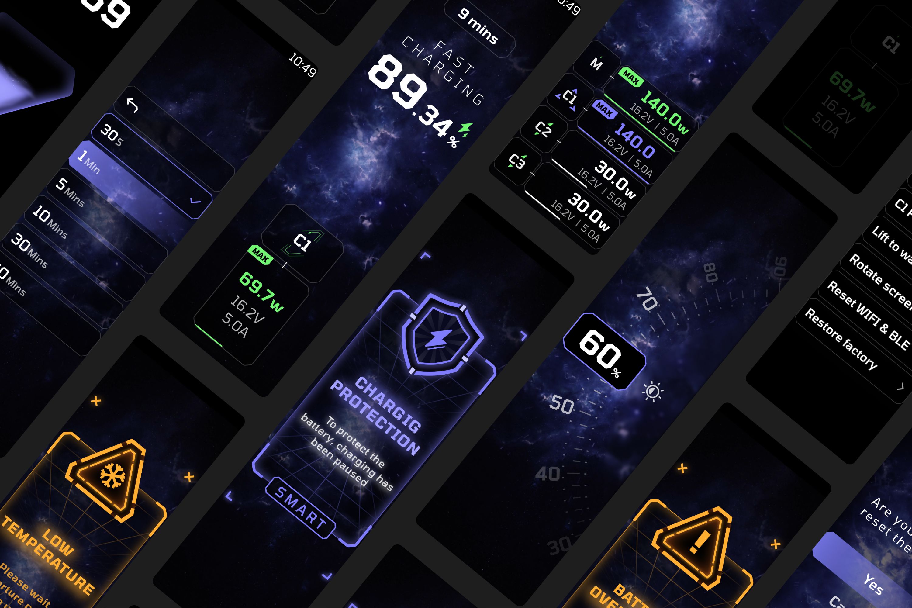 The special challenge is how to balance the function, innovation and UX of the large screen. This screen is the first large screen in the 3C industry. When designing, a purple dynamic nebula with depth is used as the background, and simple lines and data are used to display the power and power information of the power bank. Rich visual animation effects are used to enhance the visual experience of different usage scenarios of the power bank, reflect the fun and speed characteristics of the power bank, and enhance the user's pleasure when using 3C functions. From the UX visual point of view, the beauty of the product screen and the ease of use of the product are enhanced.