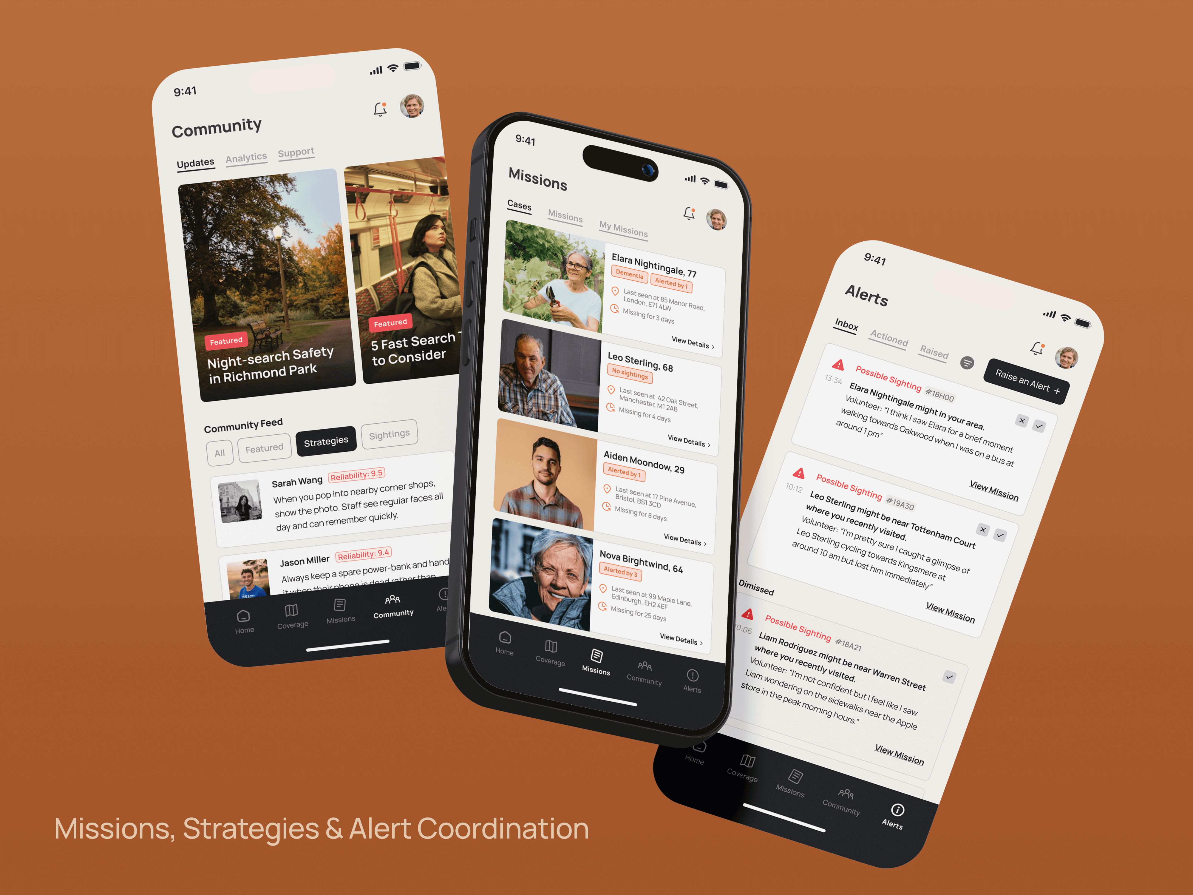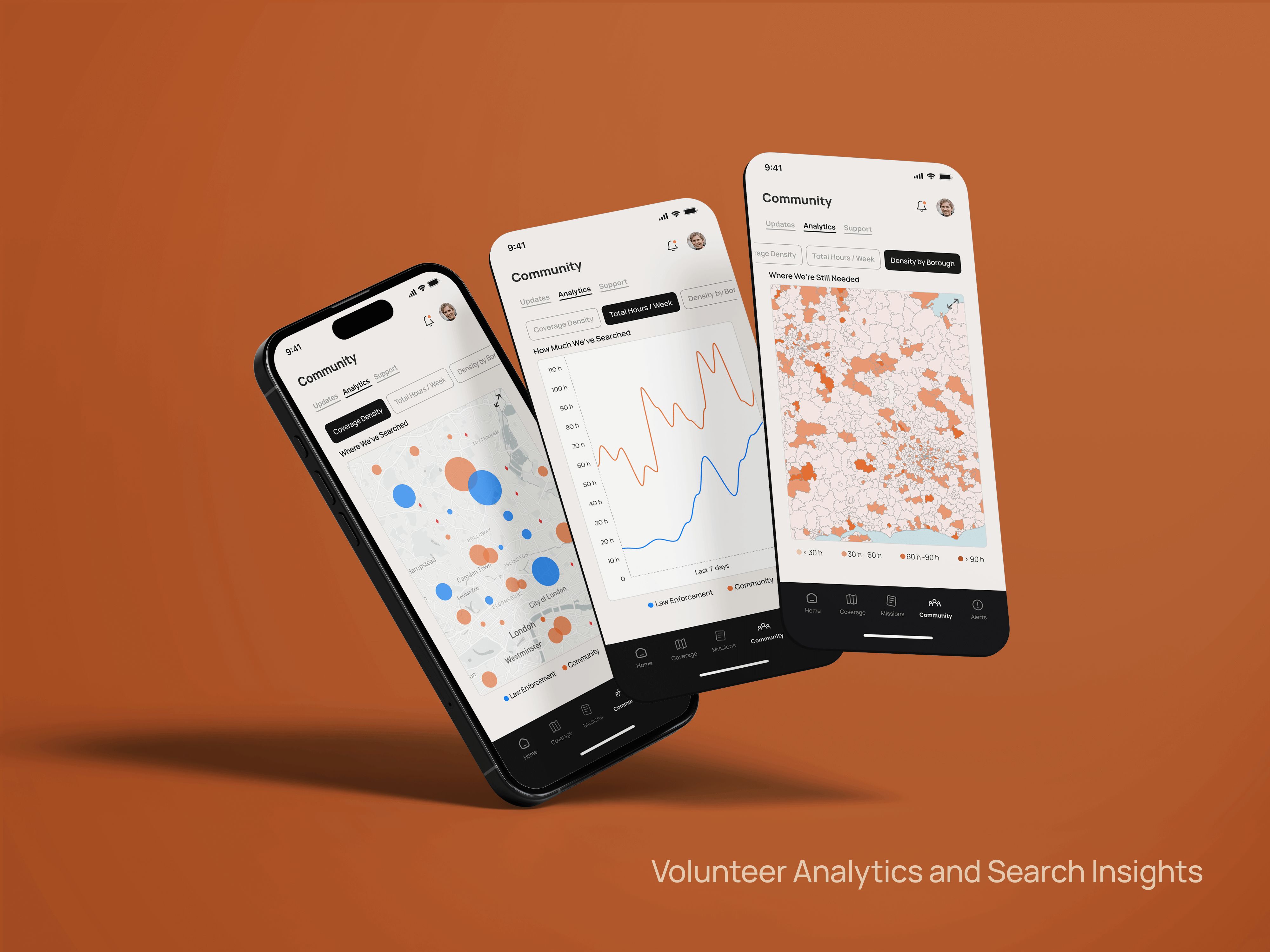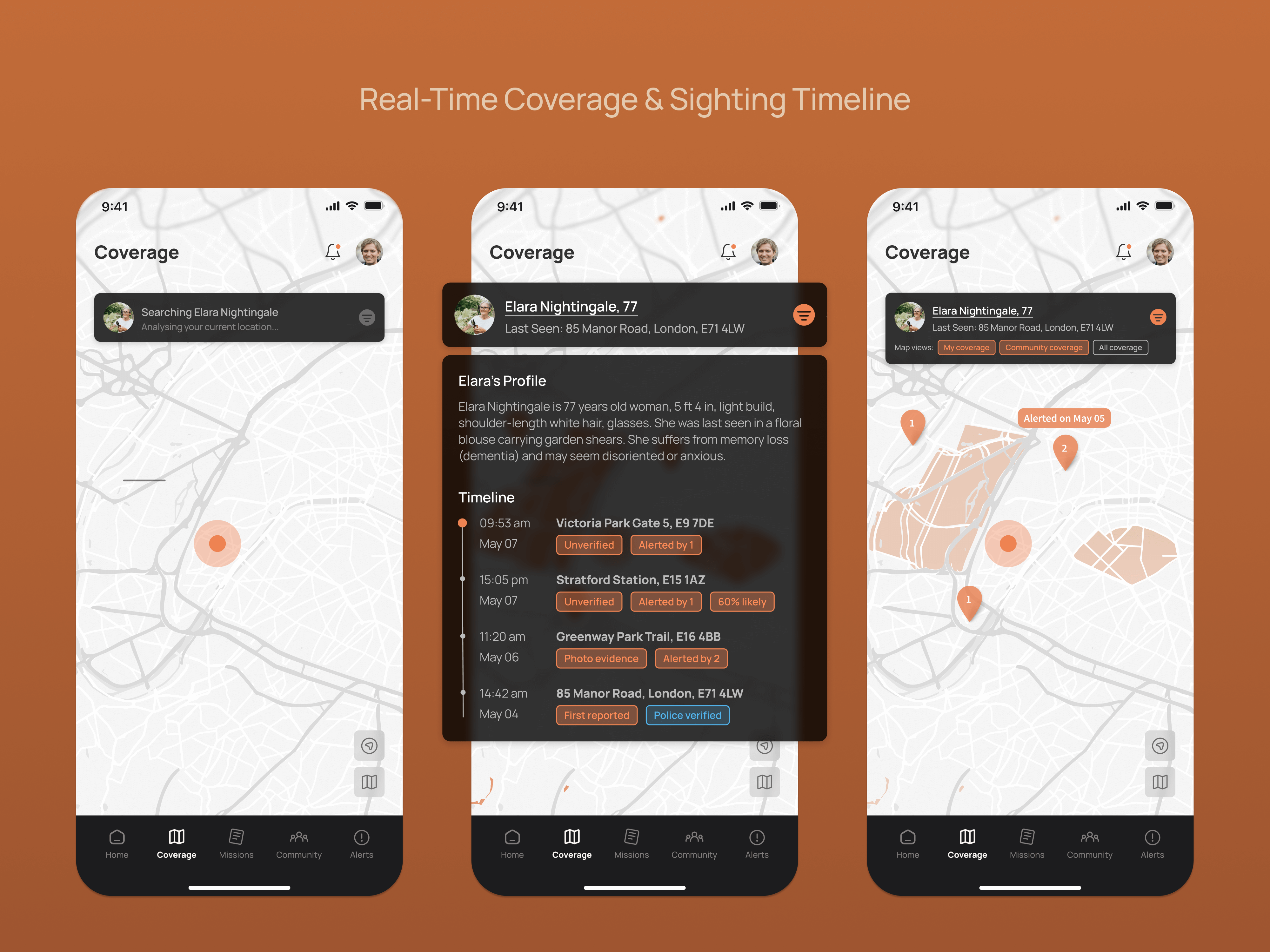 The “aha!” moment was realizing how scattered volunteer efforts often are, despite the high number of people willing to help. Interviews and existing forums showed a clear willingness, but no structured system to turn intent into impact, which inspired features like Missions, confidence-based alerts, and visual dashboards to track who searched where. It created accountability and made each contribution visible. A low point came when trying to define the Community section, as early iterations felt like static blog feeds, disconnected from purpose. So the challenge was refining it into a space for safety strategies, which somewhat helped bring relevance back.