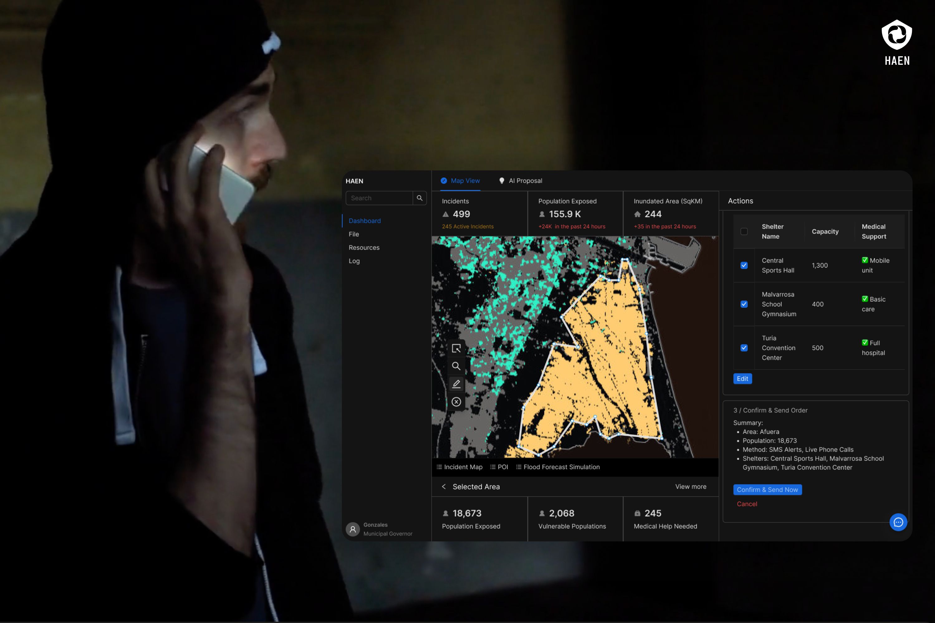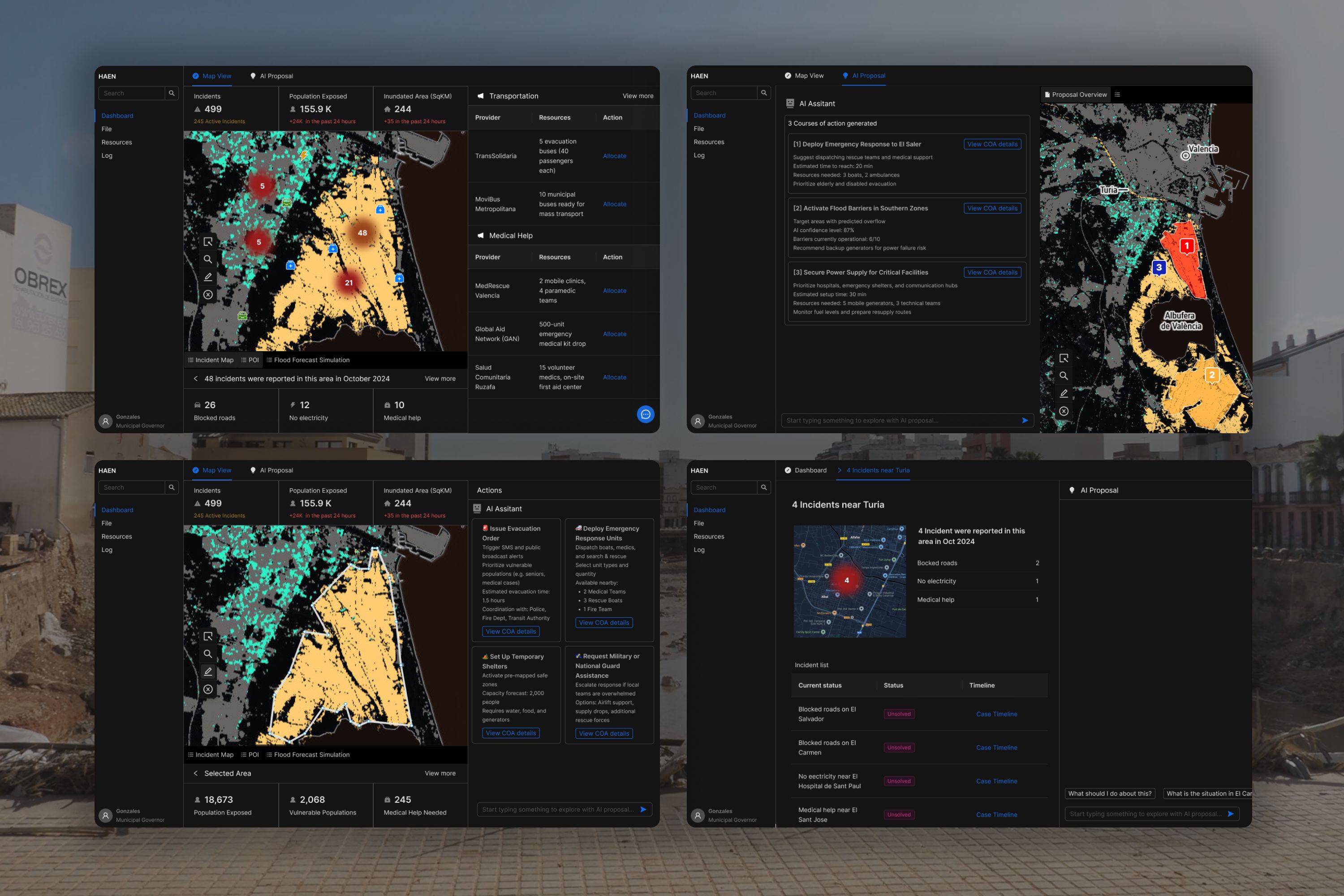 From a UX perspective, the challenge was threefold. First, we were designing for a highly stressful, time-sensitive environment where users must make life-saving decisions within seconds. Second, we had to serve two distinct user groups: government officials, who need clarity and simplicity to act quickly under pressure, but also require access to complex data for informed decisions; and residents, including elderly or non-native speakers, who need a versatile, multilingual AI agent to understand alerts and request help. Third, the AI system had to feel trustworthy—offering actionable, protocol-aligned guidance without overwhelming users in critical moments.