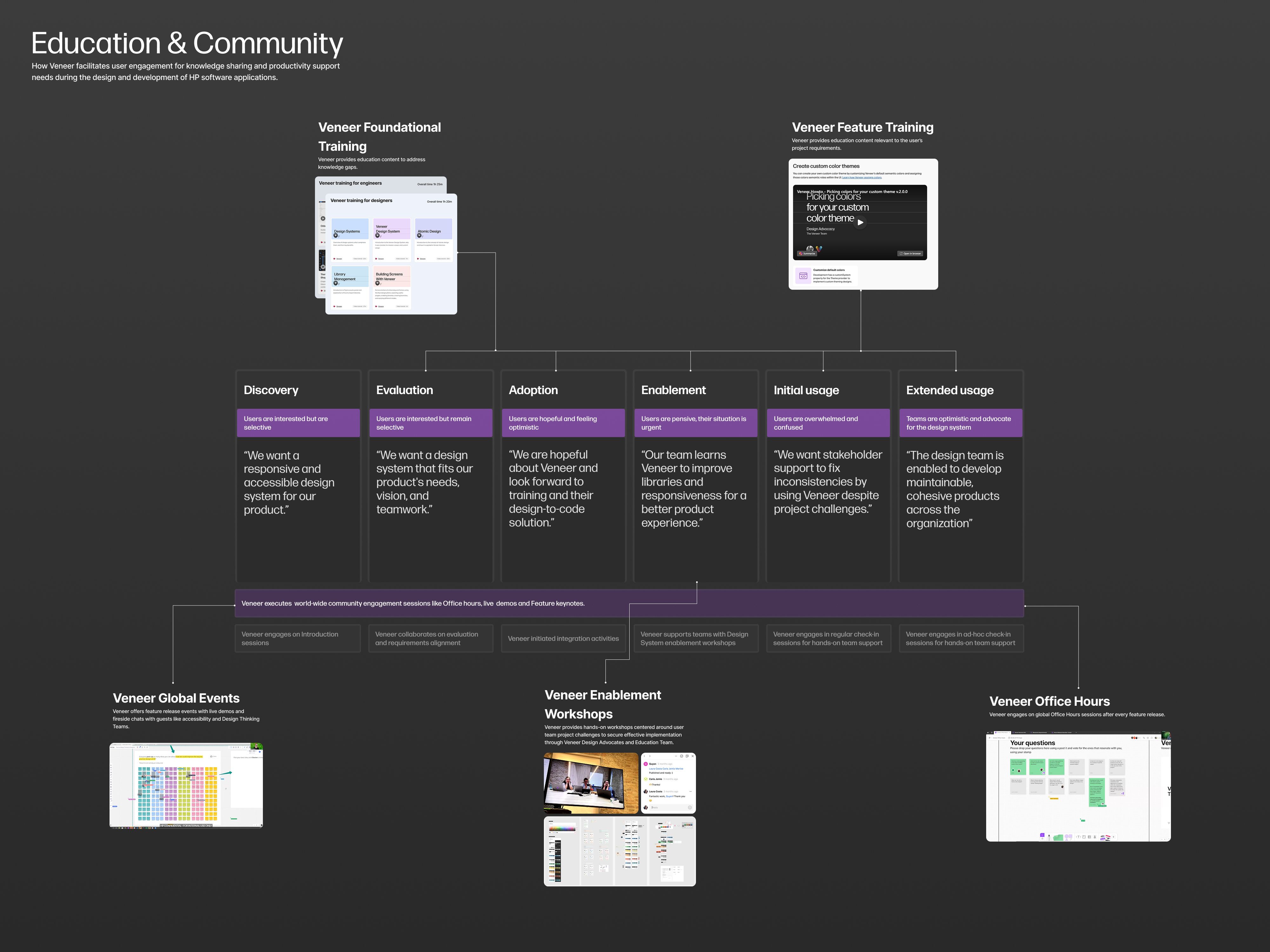 Design systems weren’t well understood, so some teams didn’t utilize Veneer or weren’t aware of how to use it. Hesitant to use something they didn’t initially understand, one set of teams told us they couldn’t adopt Veneer, while another set had more knowledge but also technical limitations preventing them from adopting Veneer. Both sets gave Veneer opportunities to improve. First, we found that design system education should be embedded into Veneer’s user journey; we created materials and features focusing on usage and best practices so Veneer users could make better HP customer experiences. Second, the user limitations helped us adapt so that more teams could benefit, making a more inclusive, flexible design system for its community.