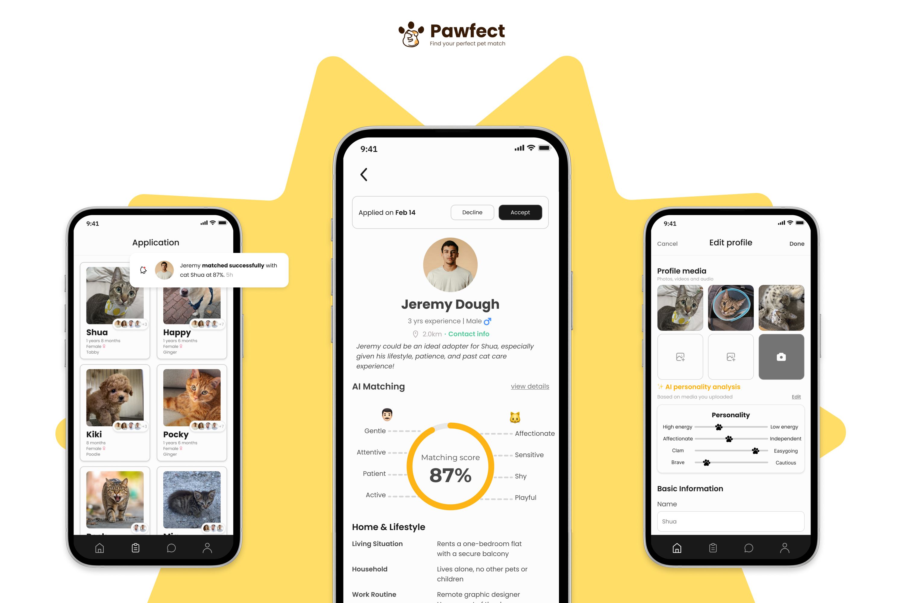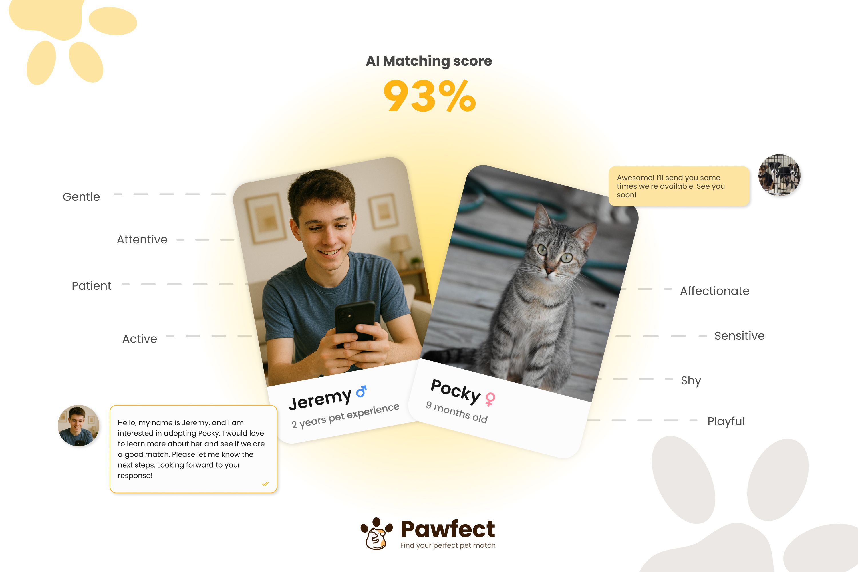 »Pawfect addresses pet abandonment by improving adoption matching and reducing returns. This enhances animal welfare and tackles a socially relevant problem, offering strong user value. The concept offers a positive user experience that is both emotionally resonant and well-crafted. Though the AI logic is still in development, it shows promising potential. With further algorithm refinement, a stronger business model, and broader stakeholder involvement, Pawfect could evolve into a high-impact product.«