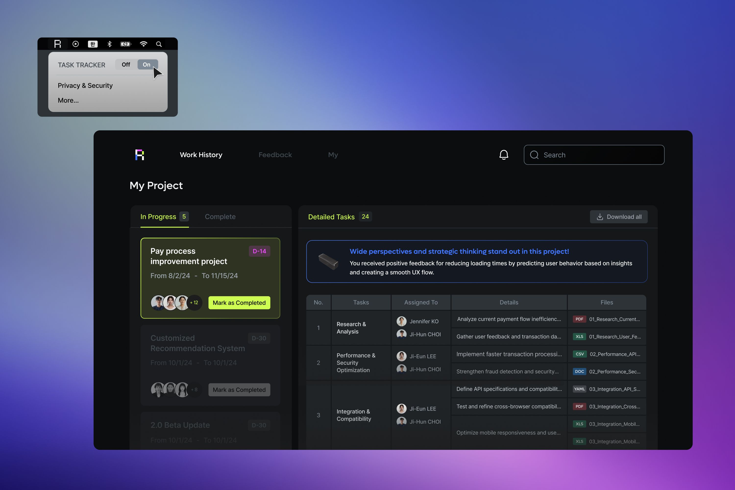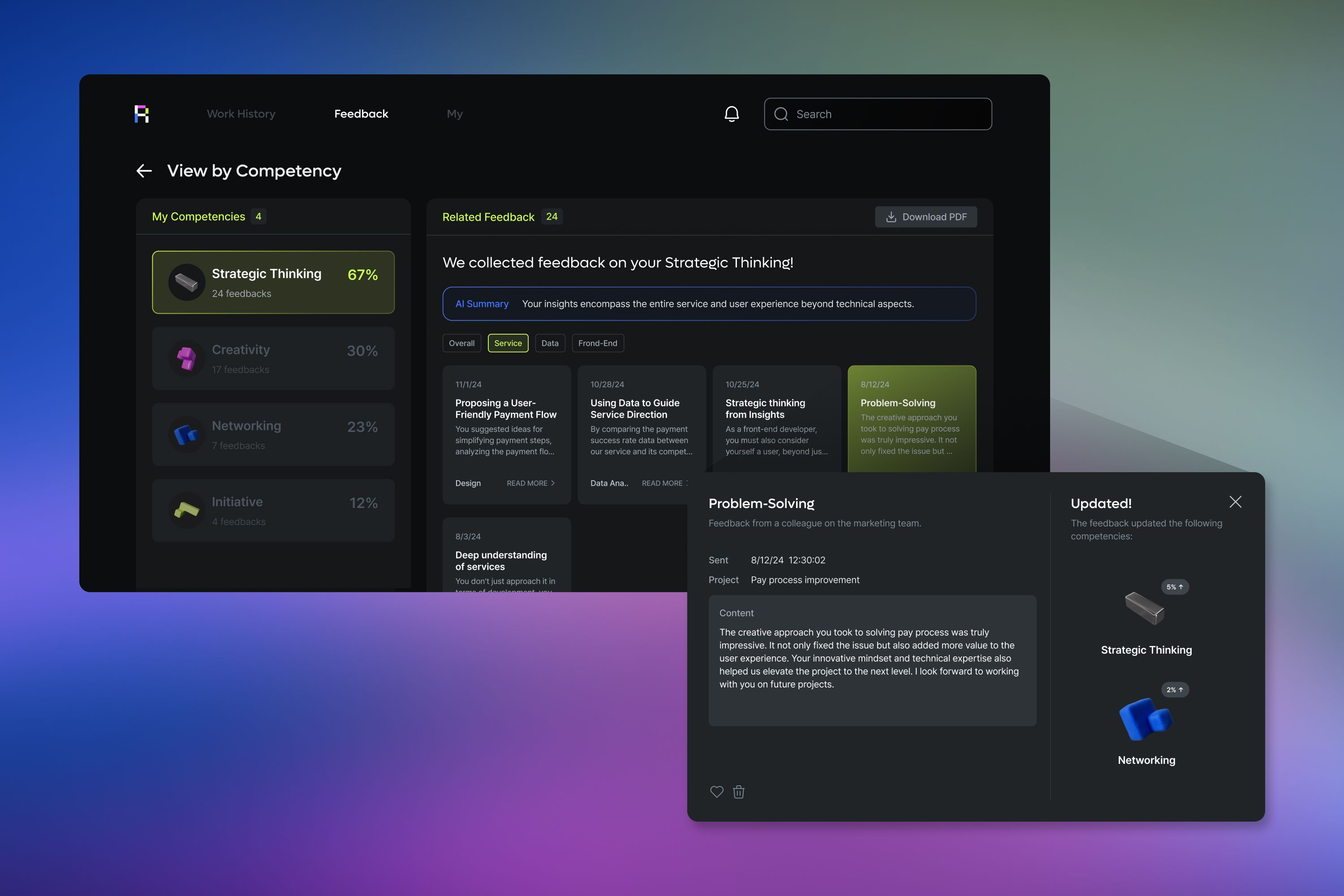The main challenge was helping professionals recognize their growth. The team initially believed employees changed jobs due to a lack of growth. However, further research revealed that the real issue was a work environment that made it difficult for them to recognize their professional growth. To address this, the team made two key features that provide objective growth indicators: a peer feedback system to enhance year-end evaluations and a work archiving feature that leverages a task-tracking plugin to document professional progress. By integrating these features, AI-generated insights allow professionals to track their skill development. Usability testing confirmed these features could be a key to helping users feel their growth.