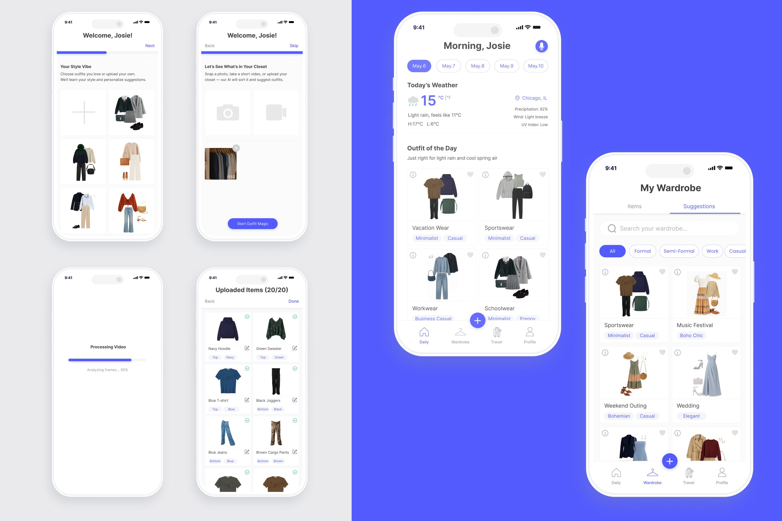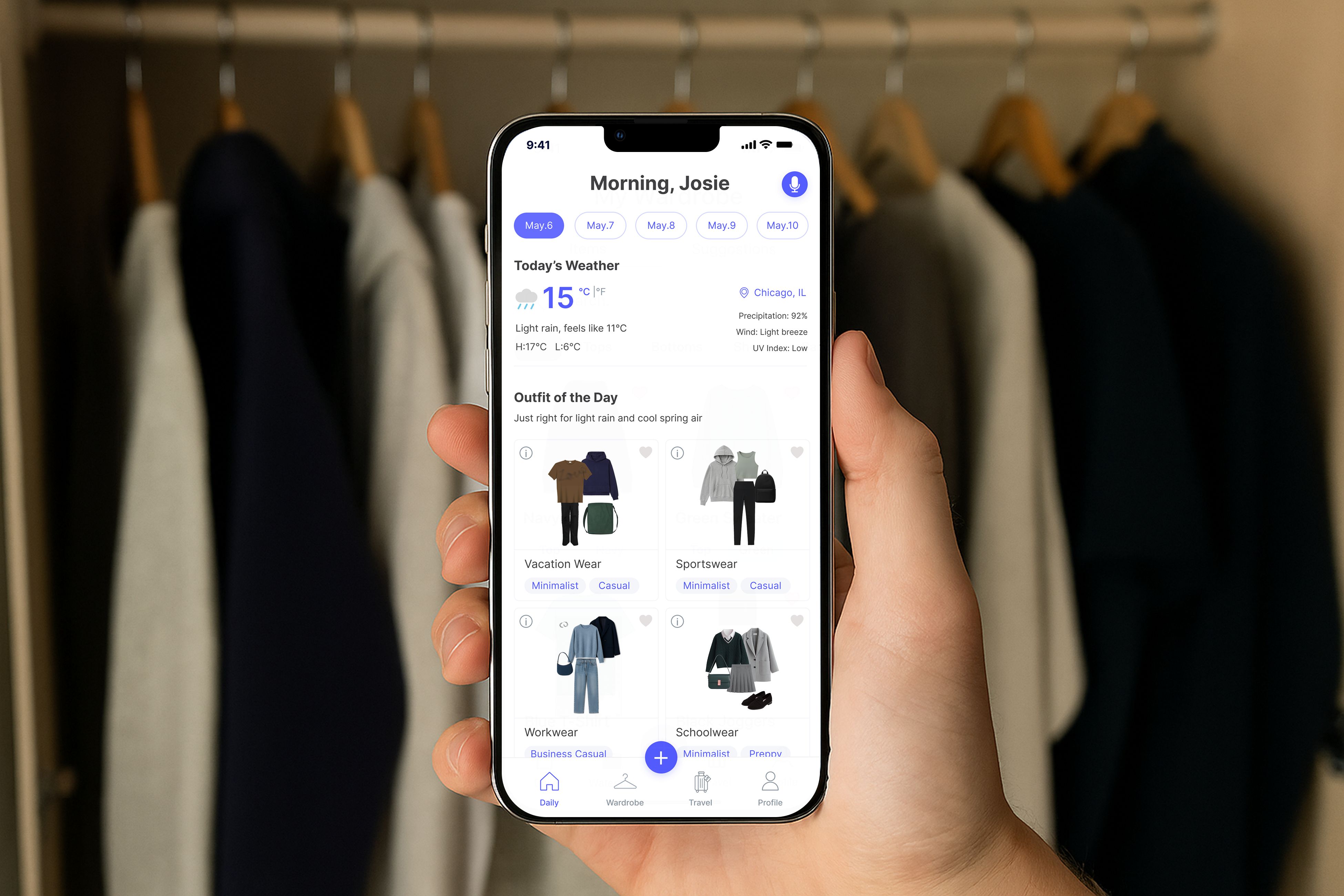 One challenge was defining the target audience, as outfit needs vary by age, gender, and fashion interest. This made ethical considerations and edge cases complex. However, user research revealed a shared behavior: most people consider the weather when getting dressed. This insight centered the experience on weather-based outfit suggestions using items users already own—offering universal relevance and reducing personalization friction.