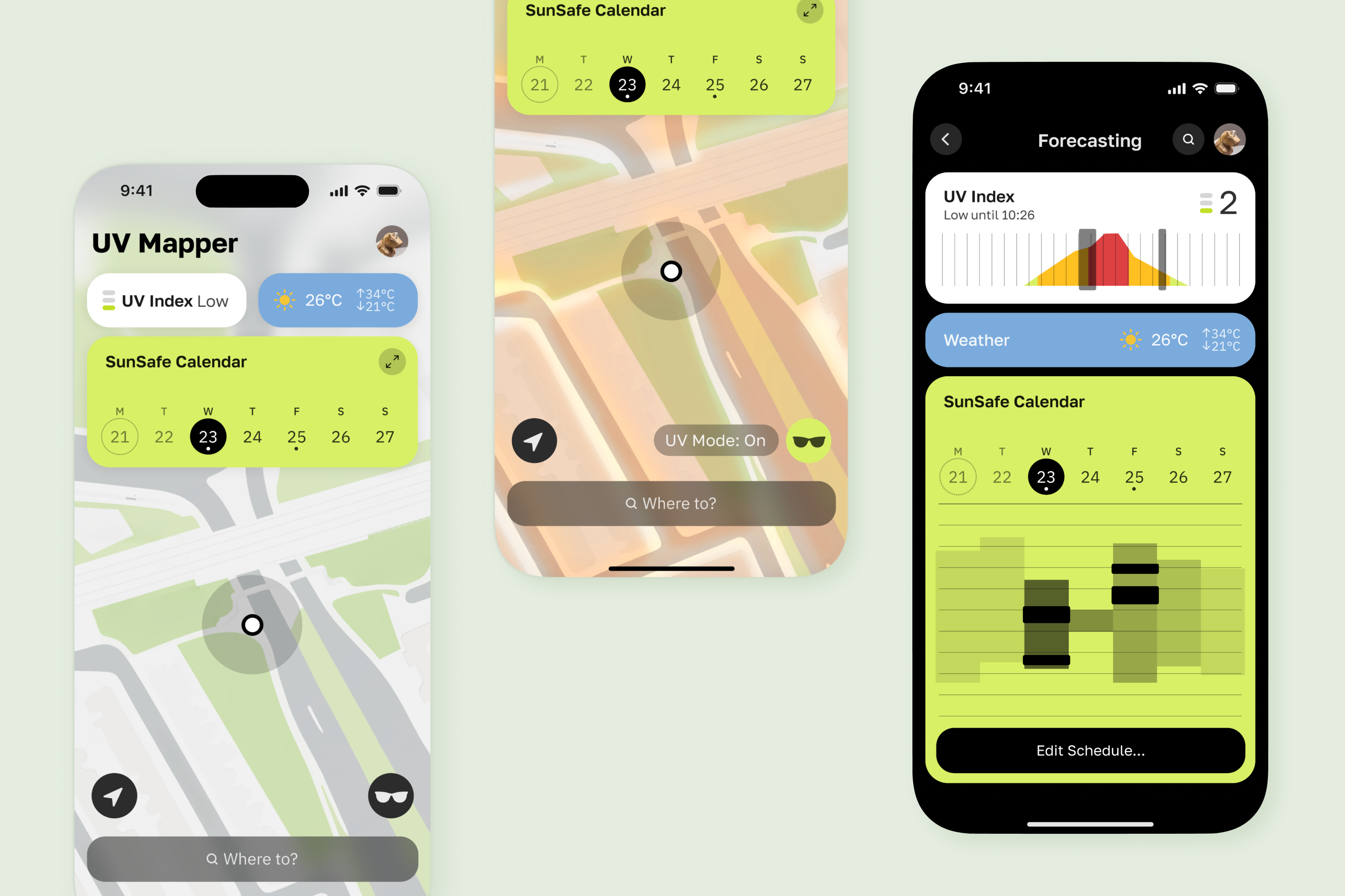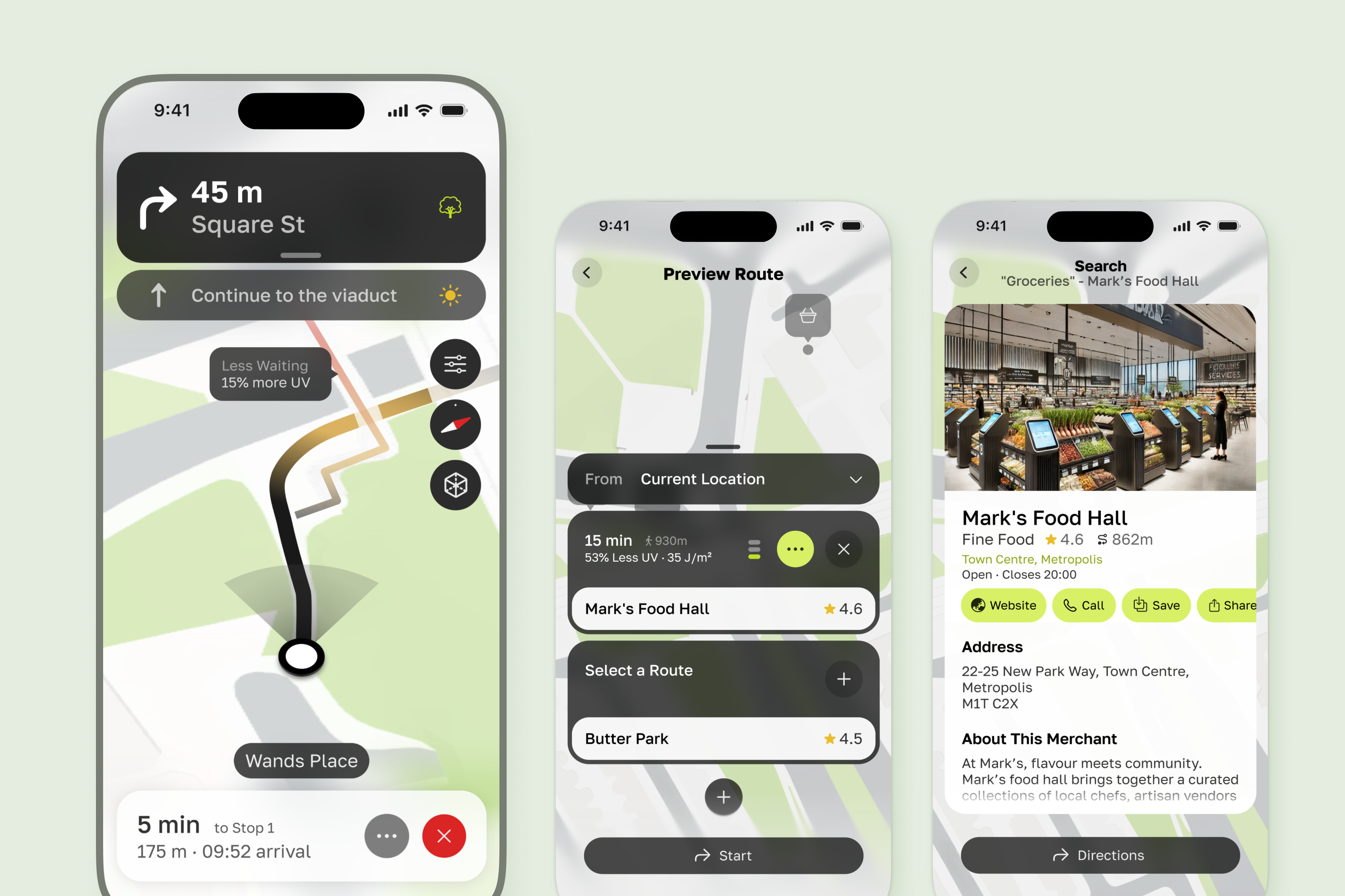 In UV Mapper, we are trying to conceptualise a useful tool that empowers those concerned or physically sensitive to UV exposure with the opportunity of exploring the city in a both protective and explorative way. The app aims to challenge the dominating status quo of delivering navigation products in an efficiency-oriented practice, so there really aren’t many products we can build upon or anchor ourselves to. Building upon our live and spatially curated UV map, demonstrating and testing the prototype helped us to include features like customisable route planning, shaded indoor routes, exposure level, and travel time balancing.