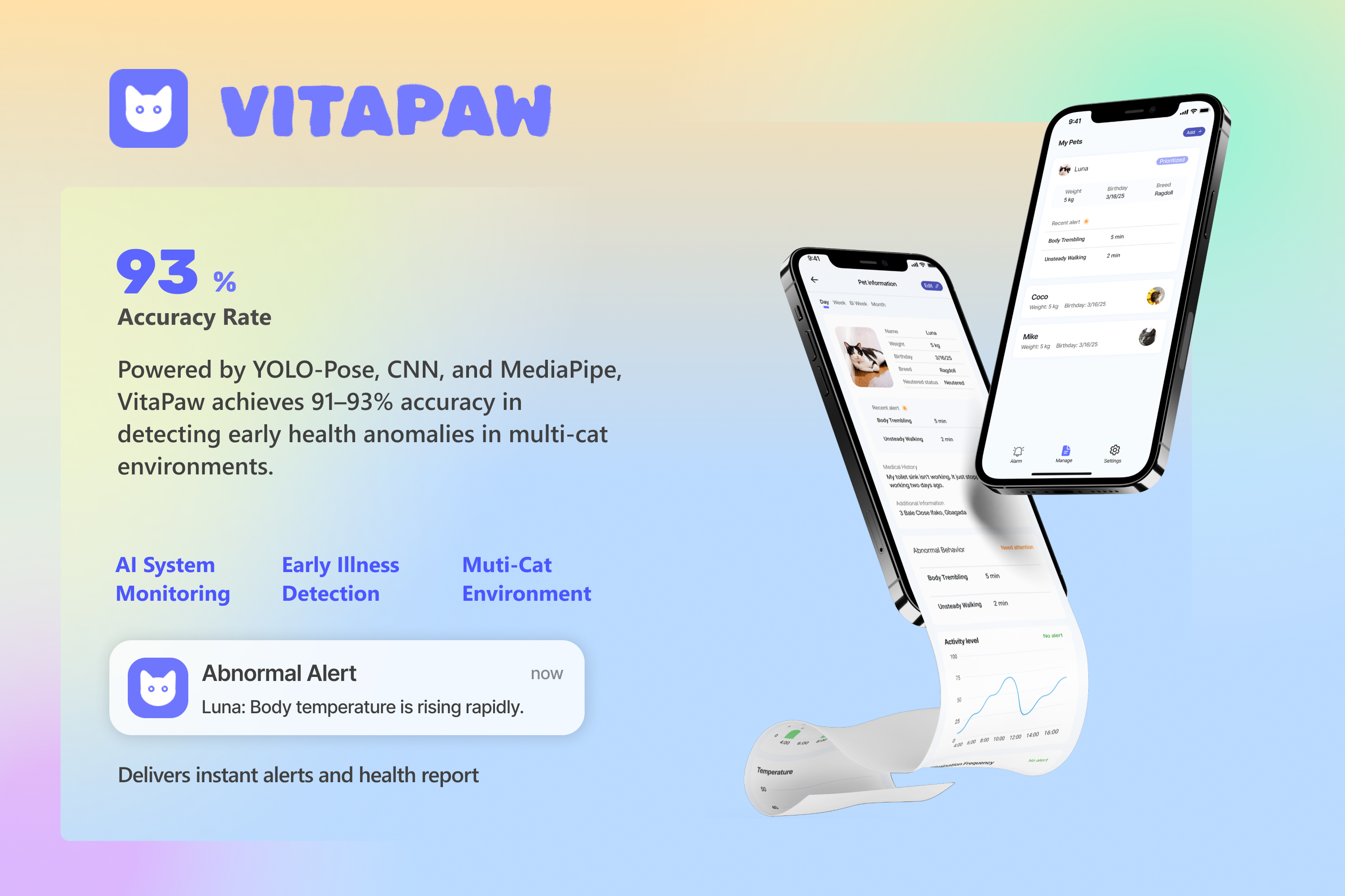 VitaPaw currently offers real-time, non-invasive monitoring, early illness detection, and an intuitive interface tailored for non-professional users in multi-cat settings. It helps caregivers make timely, informed decisions with minimal effort. In the next five years, we see VitaPaw becoming part of a broader preventive care ecosystem—integrated with veterinary services, smart homes, and pet insurance platforms. We aim to develop a more professional-grade version to support diverse use cases, from shelters to clinics, and bring greater benefits to animal welfare.