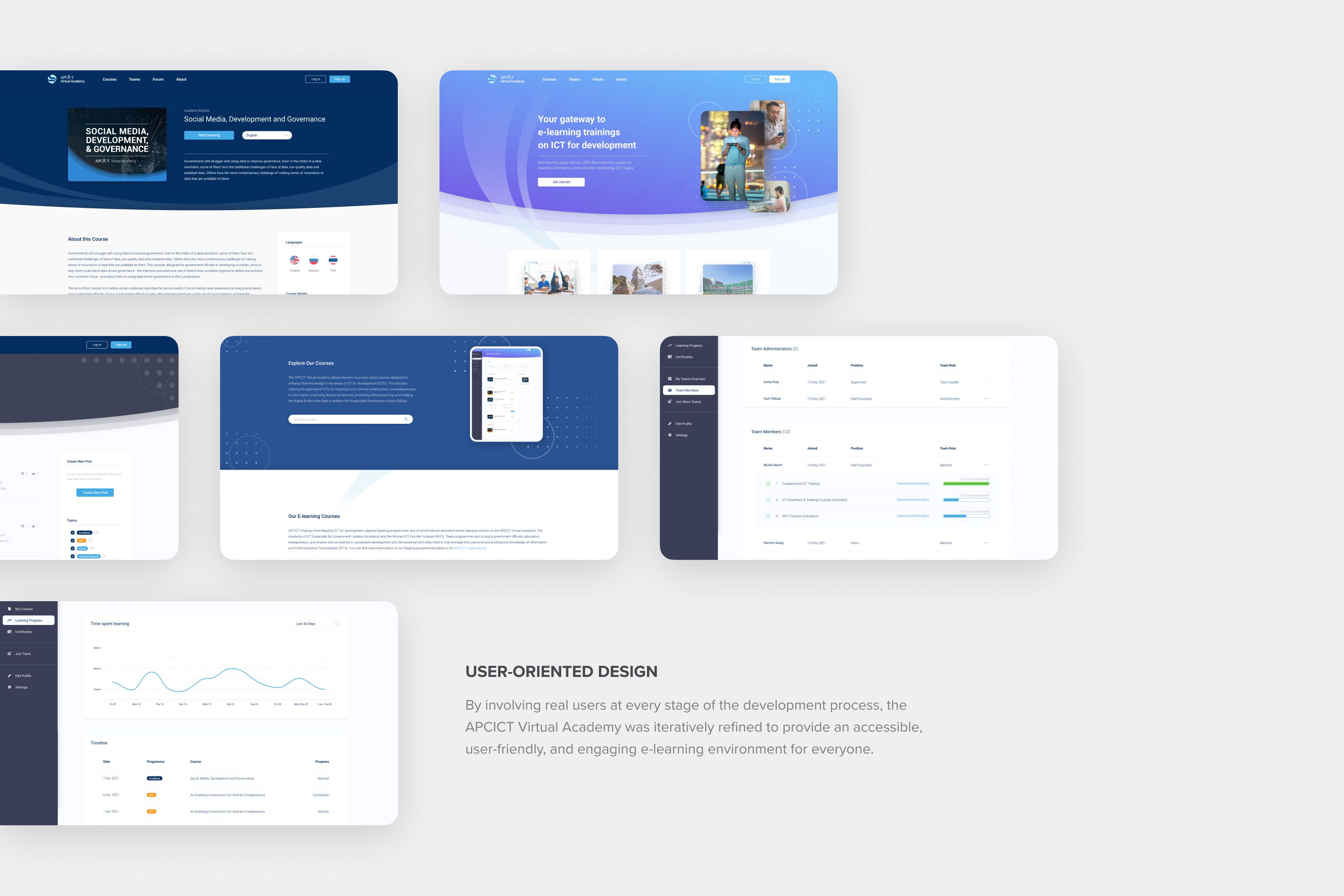 The APCICT Virtual Academy serves three distinct user groups with diverse needs and goals: government ministries, academic institutions, and women entrepreneurs from the private sector. Thus, the core UX challenge behind this project was to design a unified online platform that responds to the different learning requirements of each target group while still maintaining an overall cohesive website experience. To solve this challenge, the platform was designed to support multiple user journeys, enabling learners to engage with course content in ways that reflect their individual needs.