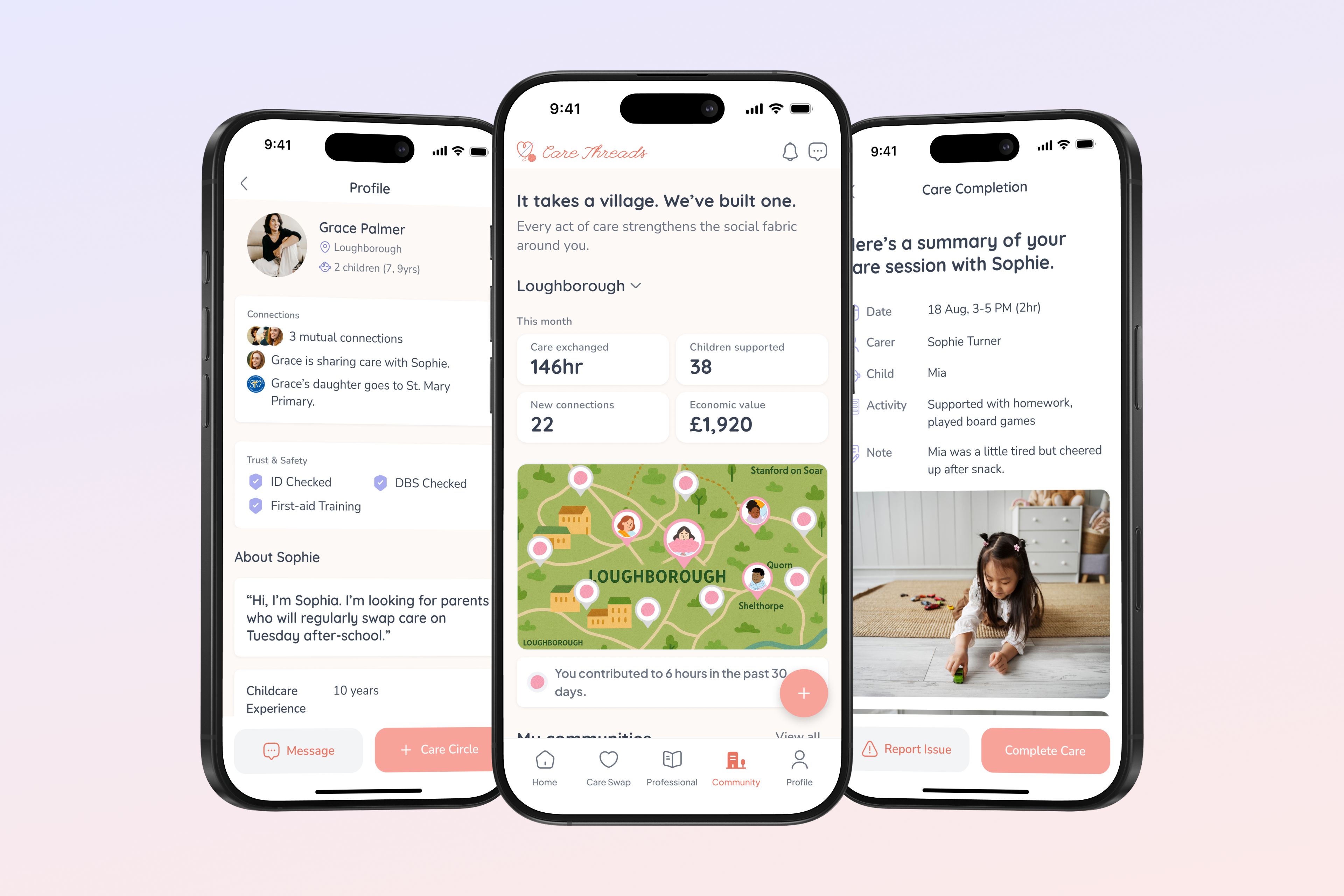 Care Threads addresses this by expanding parents’ trusted circles through mutual connections, recommendations, and shared communities. By formalising childcare exchange as a shared agreement, it reframes care from a personal favour into a reciprocal commitment, reducing emotional friction and making care exchange feel balanced.