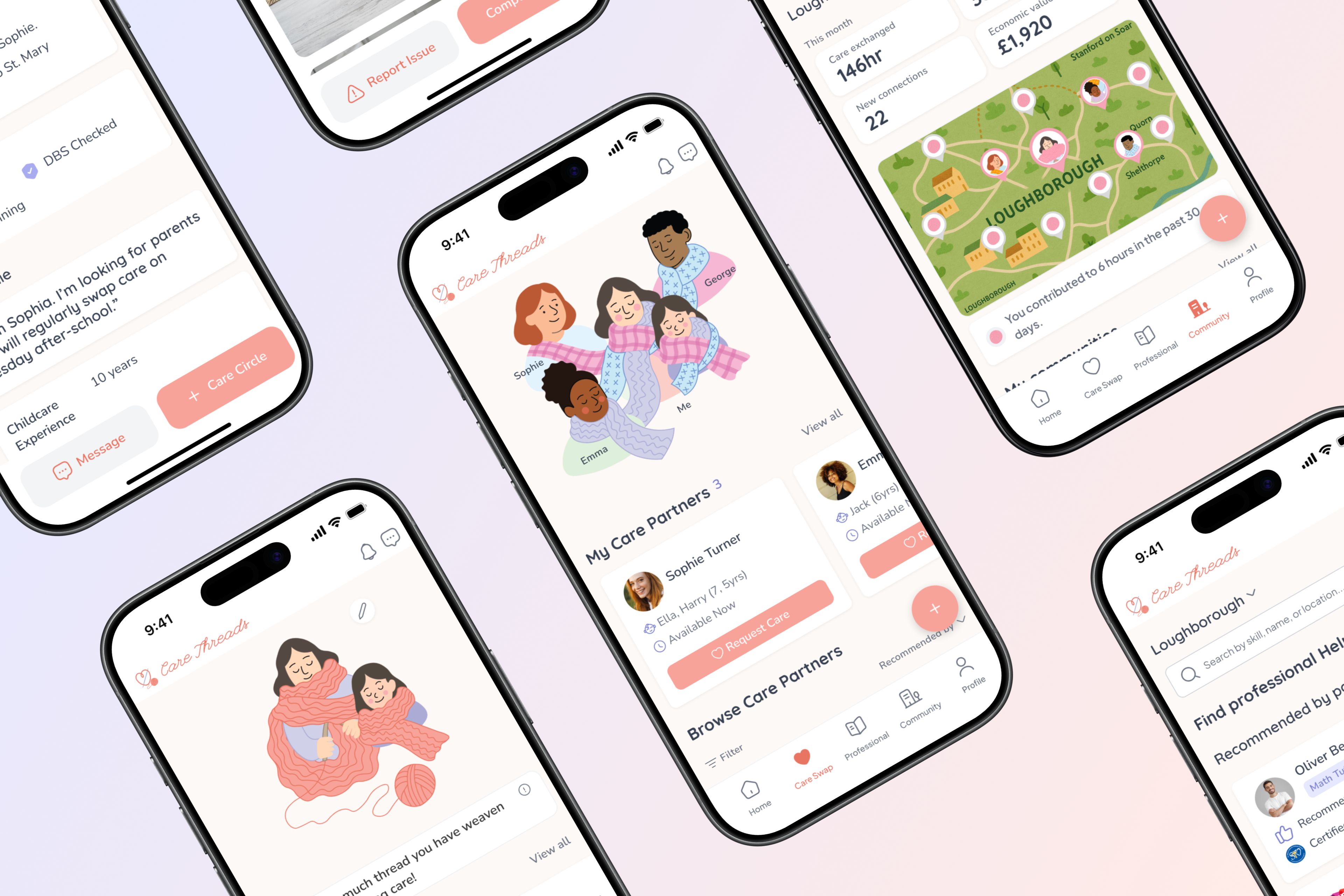 My personal highlight was developing the concept of Care Threads. Initially, the project was based on a care credit system to ensure fairness in care exchange. However, interviews revealed that parents cannot always offer care equally due to differing capacities and circumstances. During lo-fi testing, I also received feedback that the concept felt overly focused on logistics and lacked an emotional component. These insights led me to rethink what meaningful mutual care meant. I shifted my focus from transactional fairness to emotional connection, using the image of a shared scarf whose threads grow longer with each care exchange to symbolise deepening trust and relationships between parents.