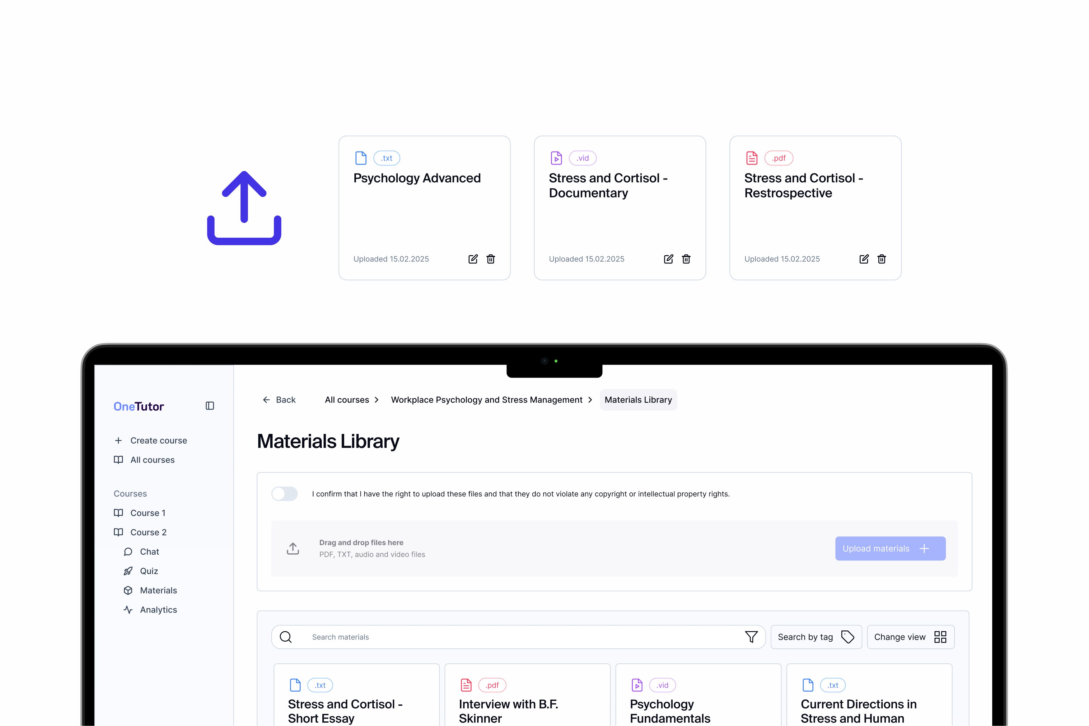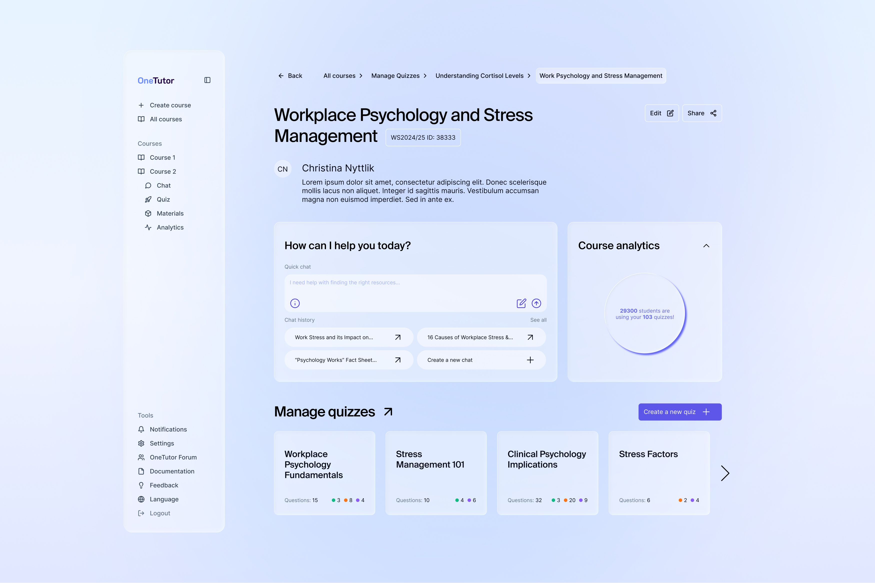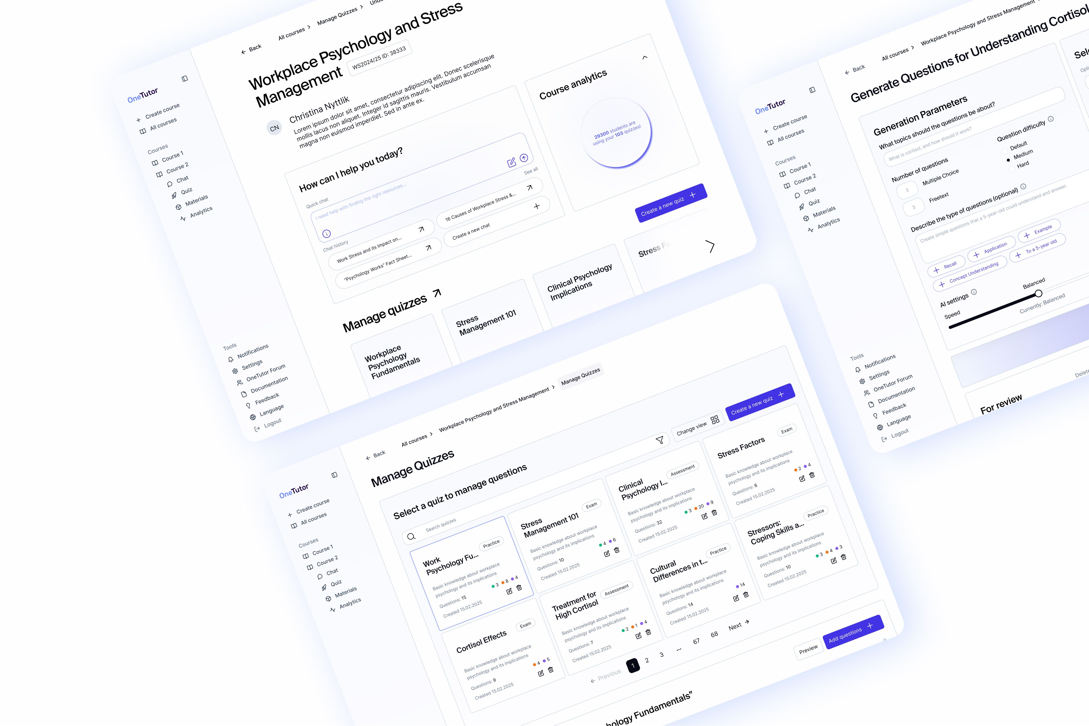 The information architecture was not yet defined, and the user flow was unclear. The goal was to generate quiz questions based on course topics. However, a university course can cover 10 topics, or just as easily 50, depending on perspective. Topics can be structured linearly, hierarchically, or as interconnected networks. Some lecturers want to keep things very simple, while others want a fully advanced setup. The challenge was to organize the course structure in a way that stays simple while still being powerful.