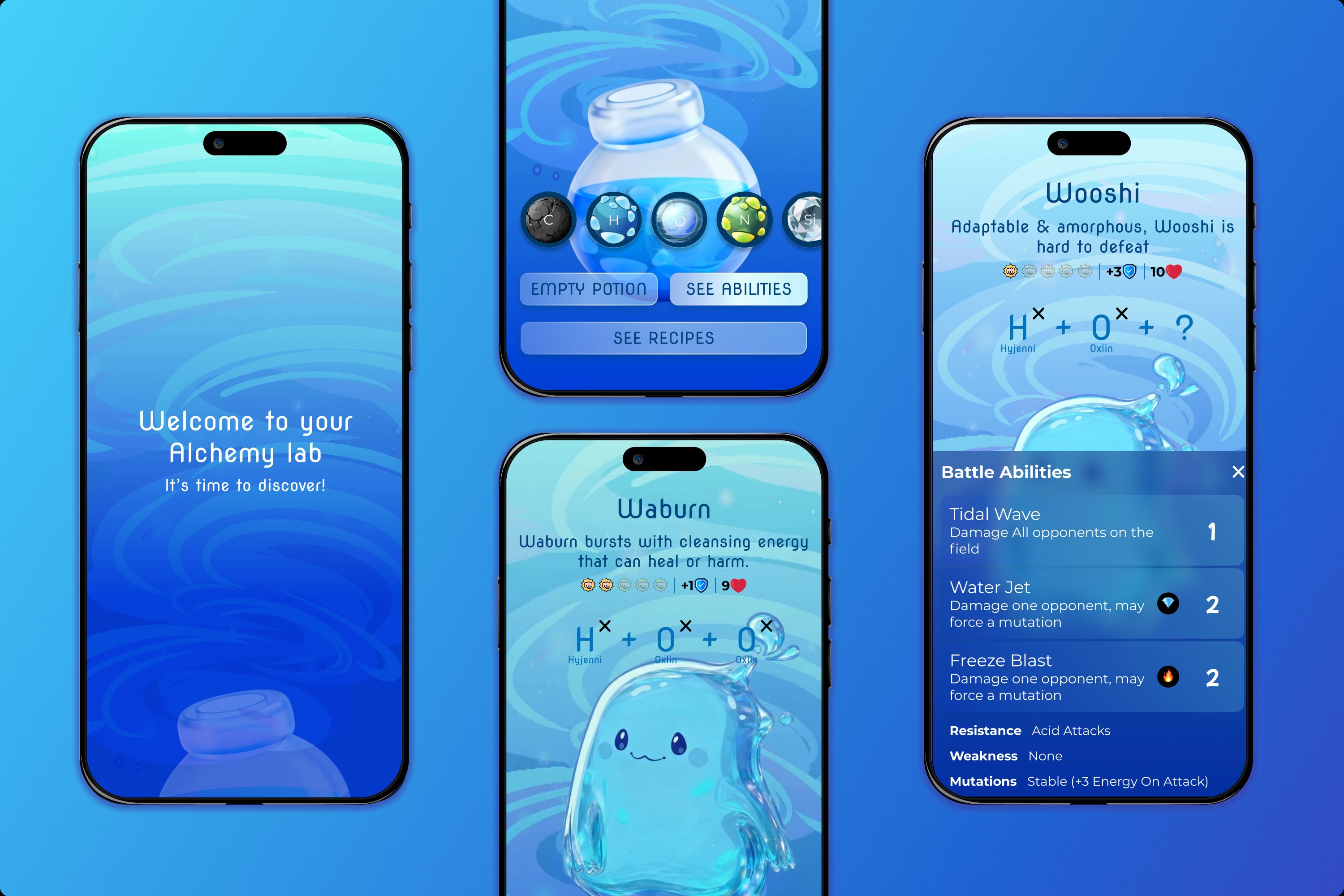 We set out to create an educational game that doesn’t feel educational, something simple to learn, fun to play, and deep enough for long-term engagement. We knew we needed to simplify the complexity of chemistry, so we focused on two core learning goals: molecules have unique properties, and when molecules interact, they create reactions. These goals defined where to stay true to science and where to gamify. Molecules become imaginative characters inspired by their chemical properties. Battles mirror real chemical reactions, showing factors that influence reactions, common reaction types, and signs of chemical change. Players absorb these concepts naturally as they discover characters, learn their abilities, and develop strategic matchups.