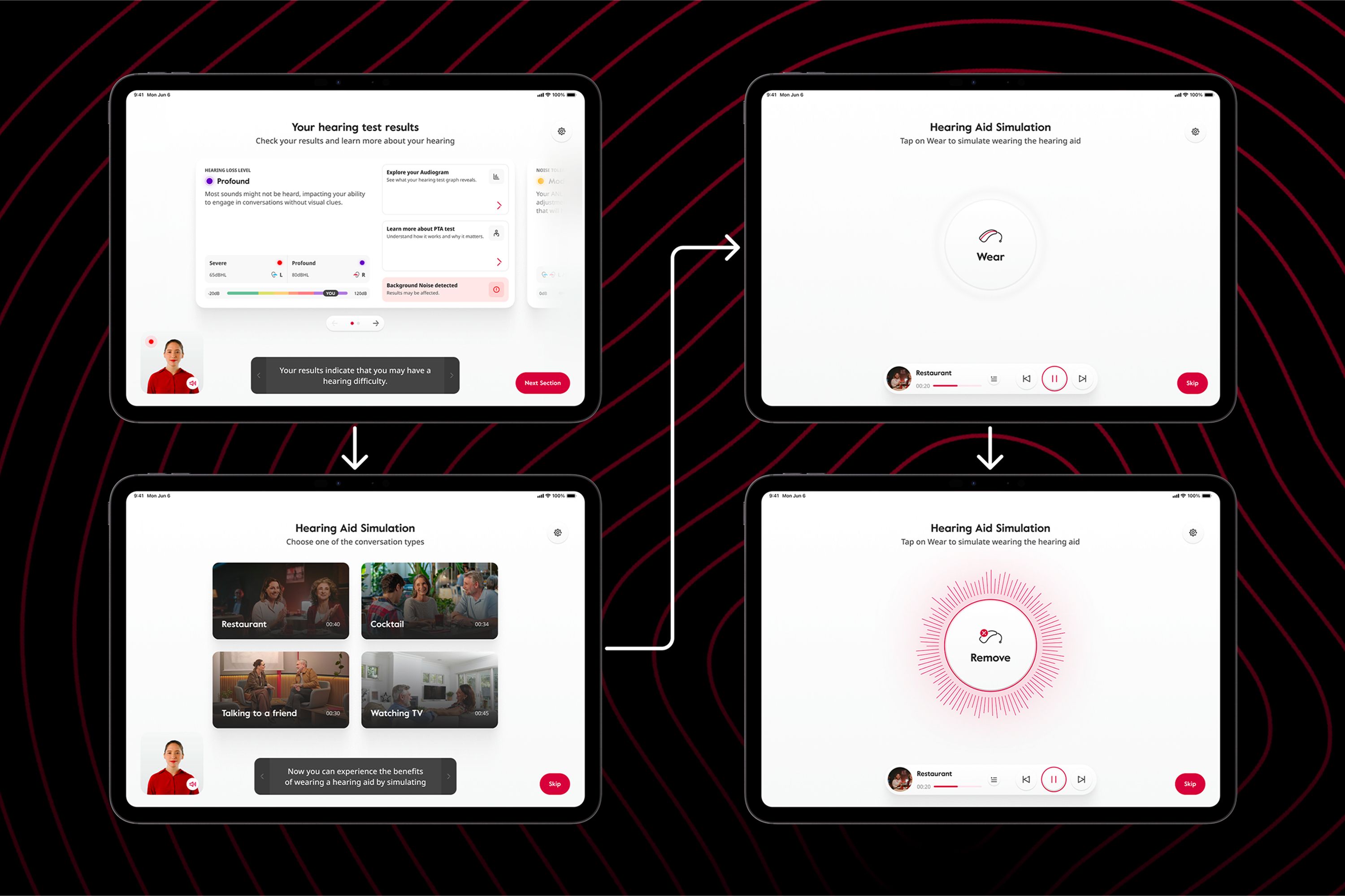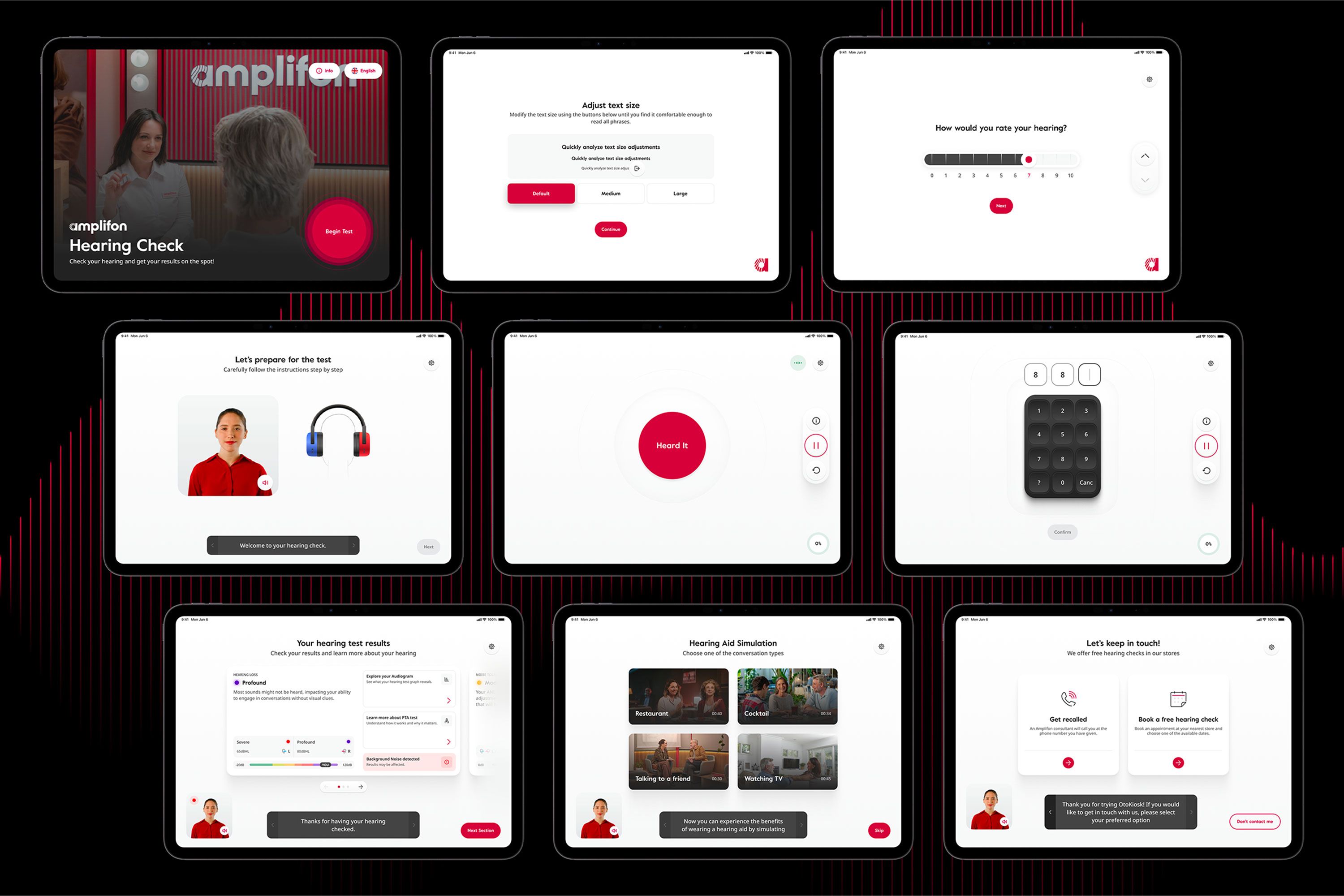 The core UX challenge was designing a fully autonomous hearing-test experience for users with very diverse levels of digital literacy. We needed to ensure medical-grade accuracy while keeping the flow intuitive, stress-free, and extremely clear. OtoKiosk had to work in noisy retail environments, during events and across a wide range of situations. We needed to design a solution able to guide people step-by-step without staff assistance, while also managing accessibility needs. Balancing simplicity, reliability, and clinical rigor was the heart of the UX challenge.