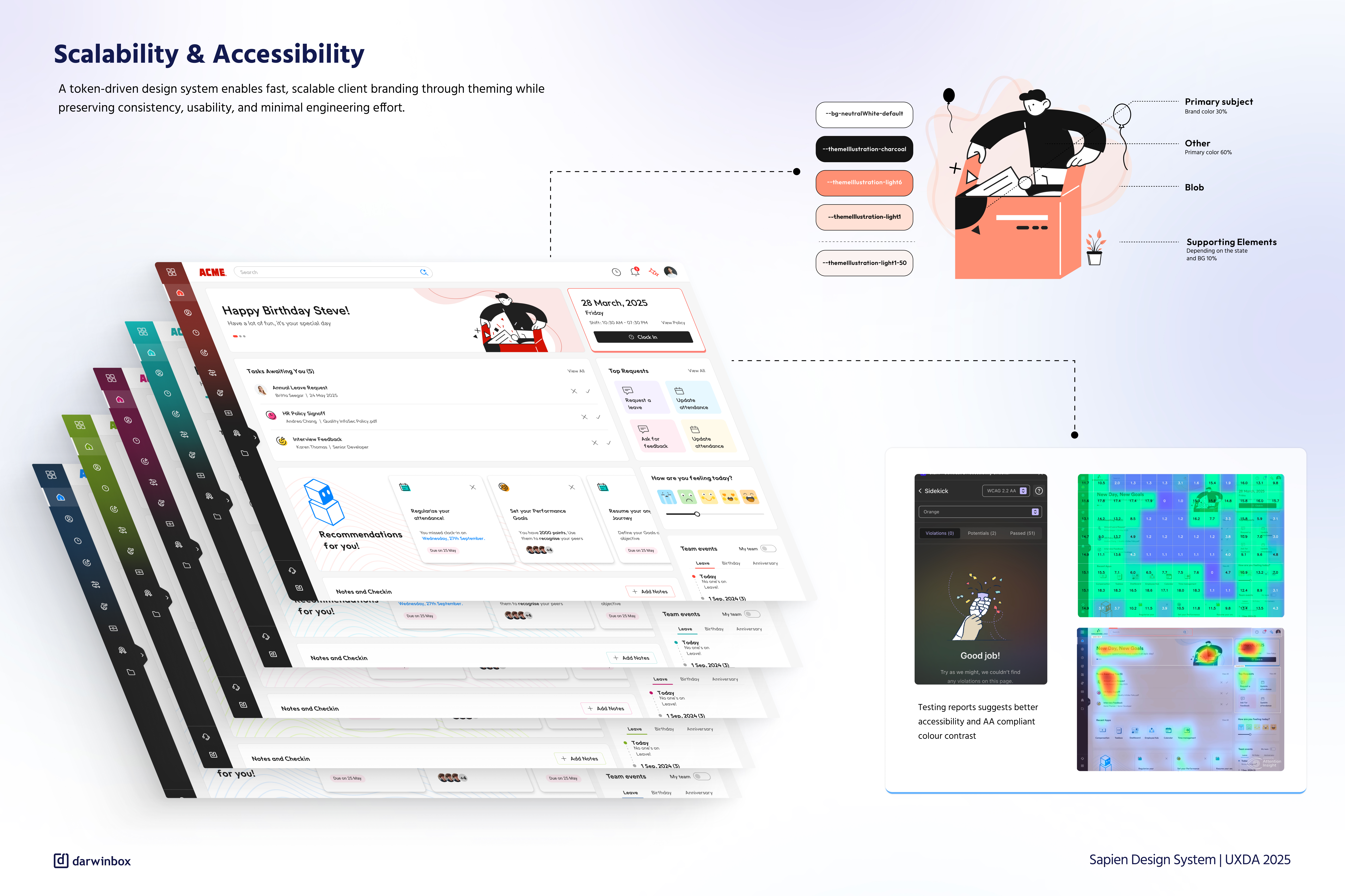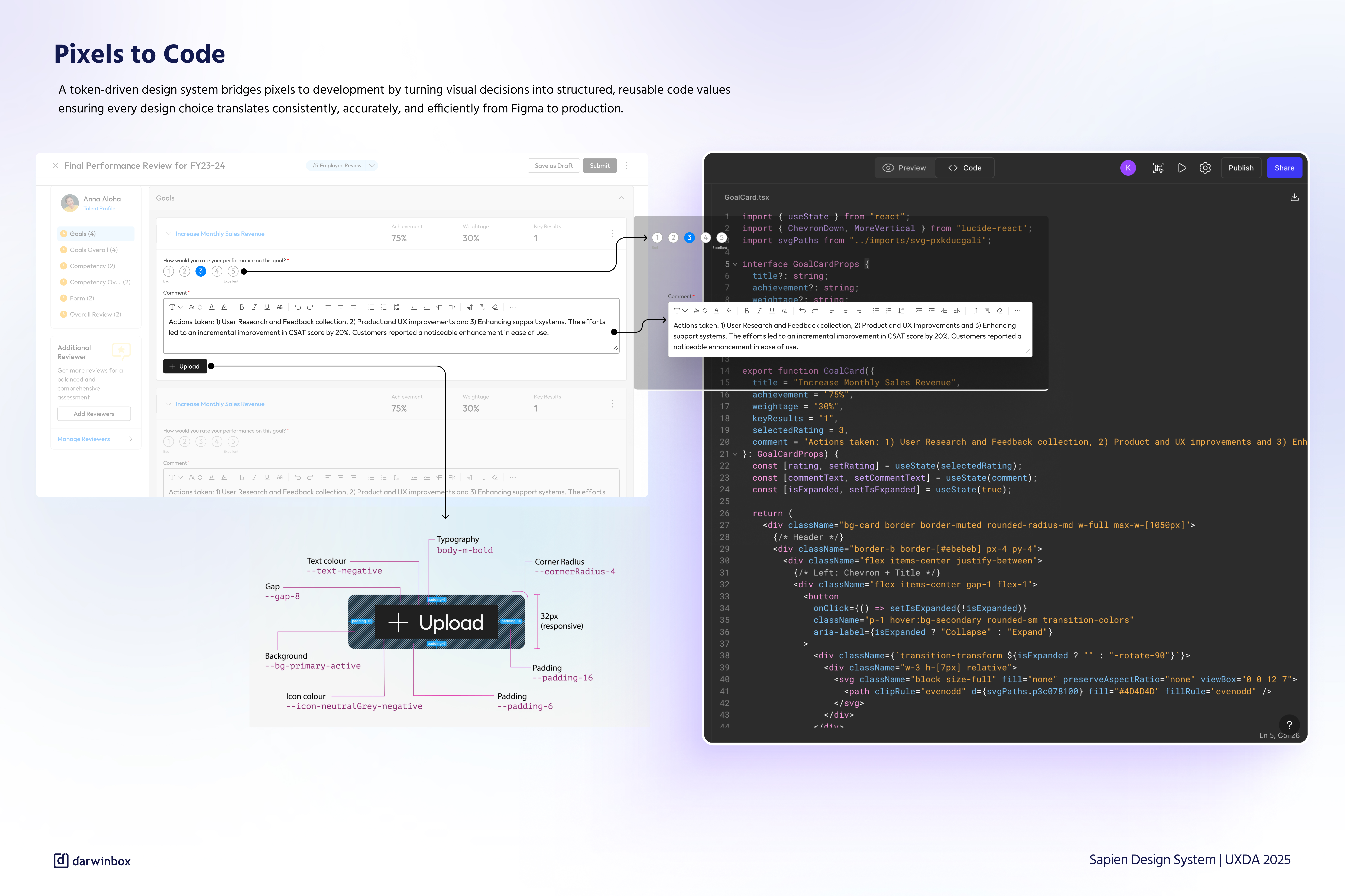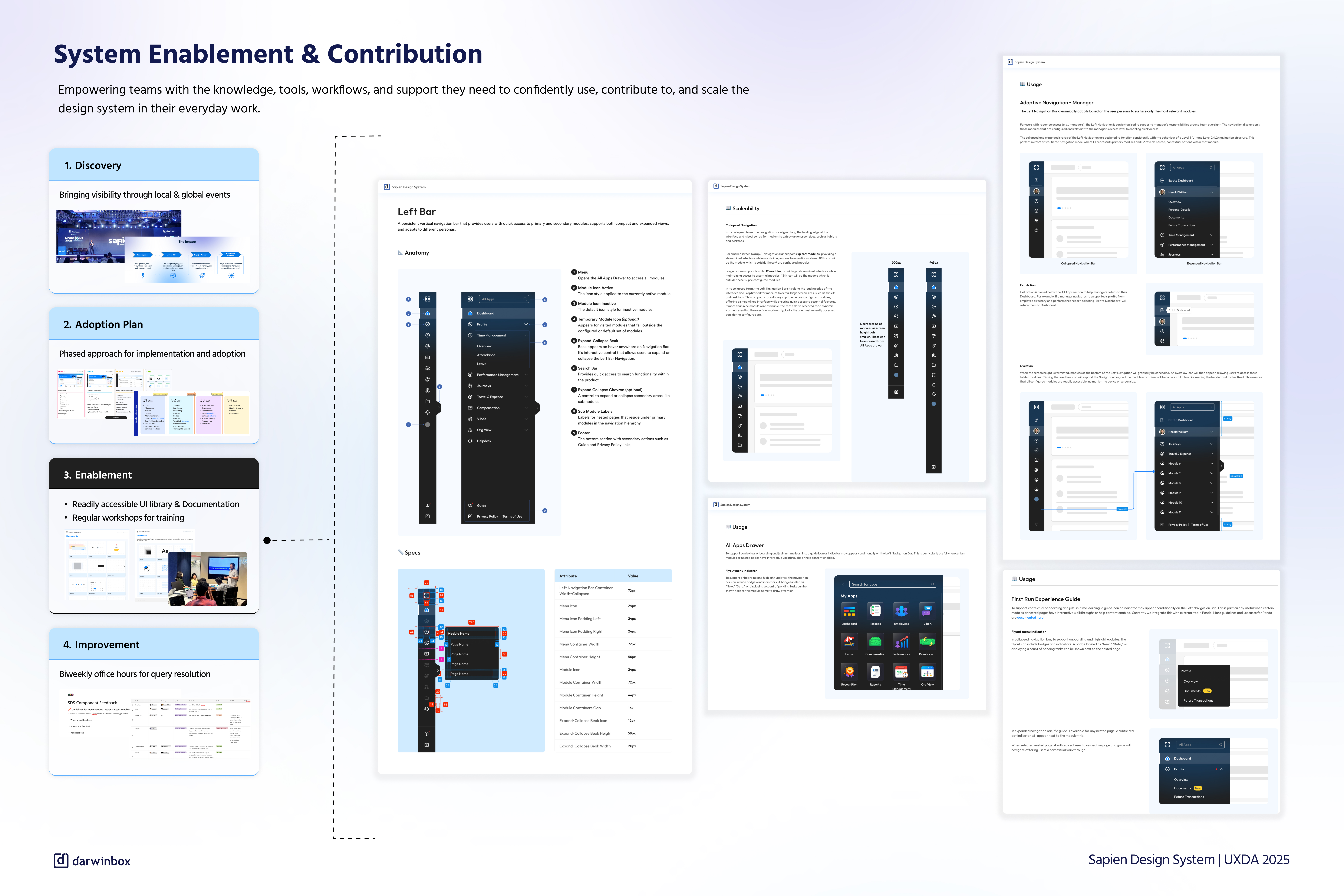 The core challenge was unifying a rapidly scaling, enterprise-grade HCM that had evolved organically over time. Today, Darwinbox serves more than four million users across 130 countries, supporting over 30 personas through an interconnected suite of 14 products and thousands of workflows. While powerful, this scale introduced fragmentation, uneven UX maturity, inconsistent patterns, and rising cognitive load for users navigating the ecosystem. The only viable path forward was to create a system that could scale over time—one that unifies design and development into a single, shared foundation while remaining flexible enough to support continuous growth. This led to the creation of Sapien, built around five pillars: Human, Evolving, Minimal, Inclusive, and Trustworthy.