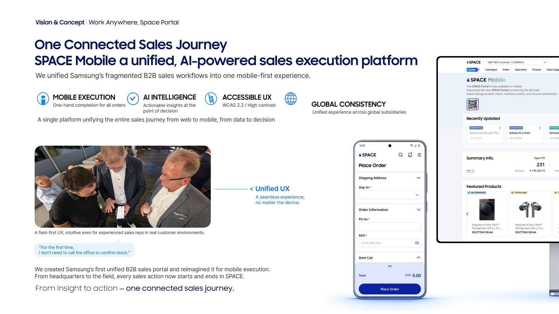 In five years, I see this platform becoming a fully AI-driven global sales hub that supports every stage of the customer journey. What we built is more than a mobile app; it is the foundation for how Samsung’s worldwide sales teams will operate with speed and clarity. I hope to continue leading large-scale UX transformations, using evidence-based research and structural problem-solving to simplify complex enterprise systems. This project is a blueprint for global UX integration, and I aim to expand its impact across more regions and industries.