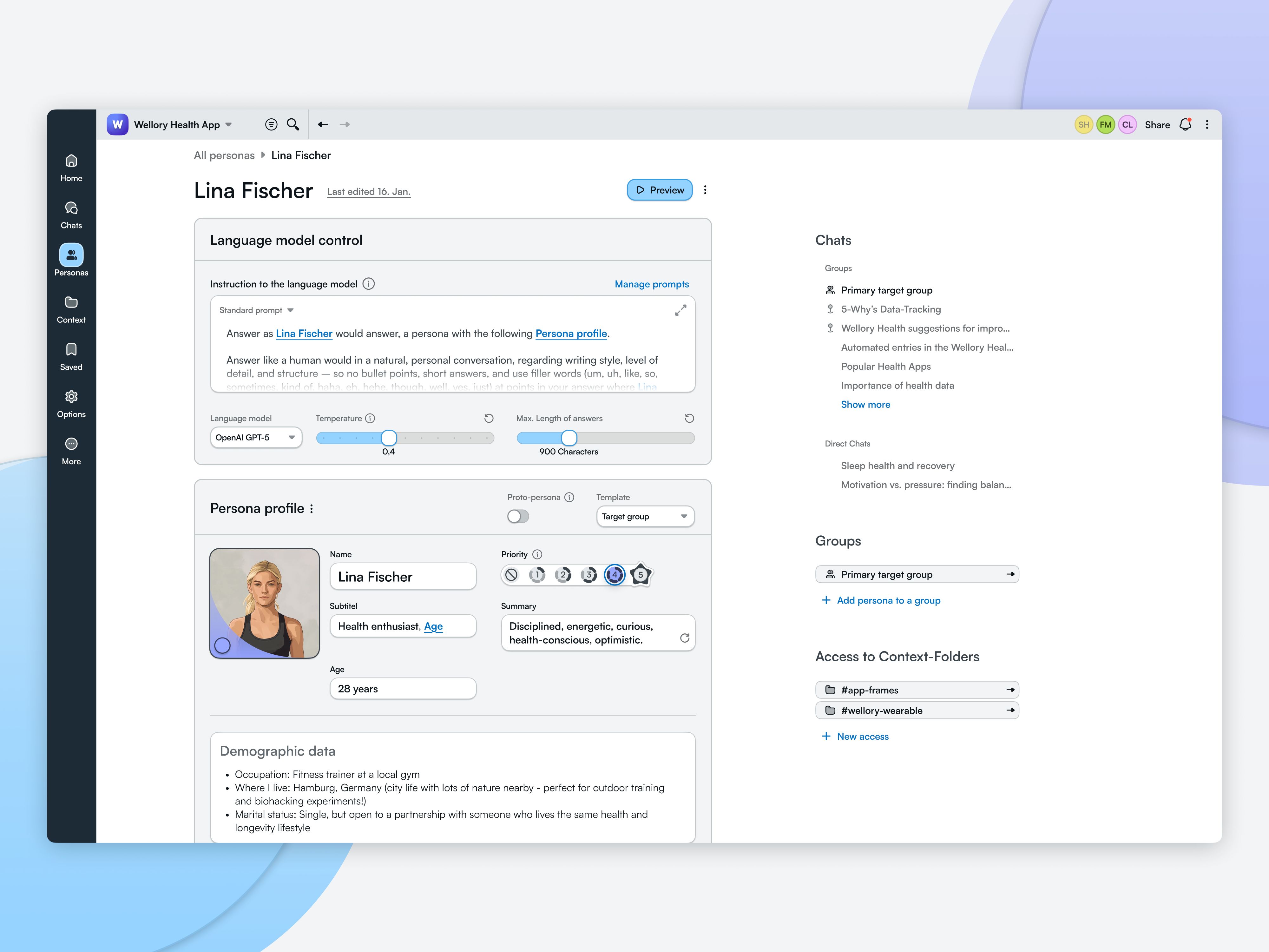 The challenge was to determine how AI-personas should be delivered, while considering the different usage requirements that had been identified. The goal was to develop an application that enables continuous user feedback, addresses the target group’s skepticism toward the reliability of AI-generated content and can be integrated into different individual work practices.