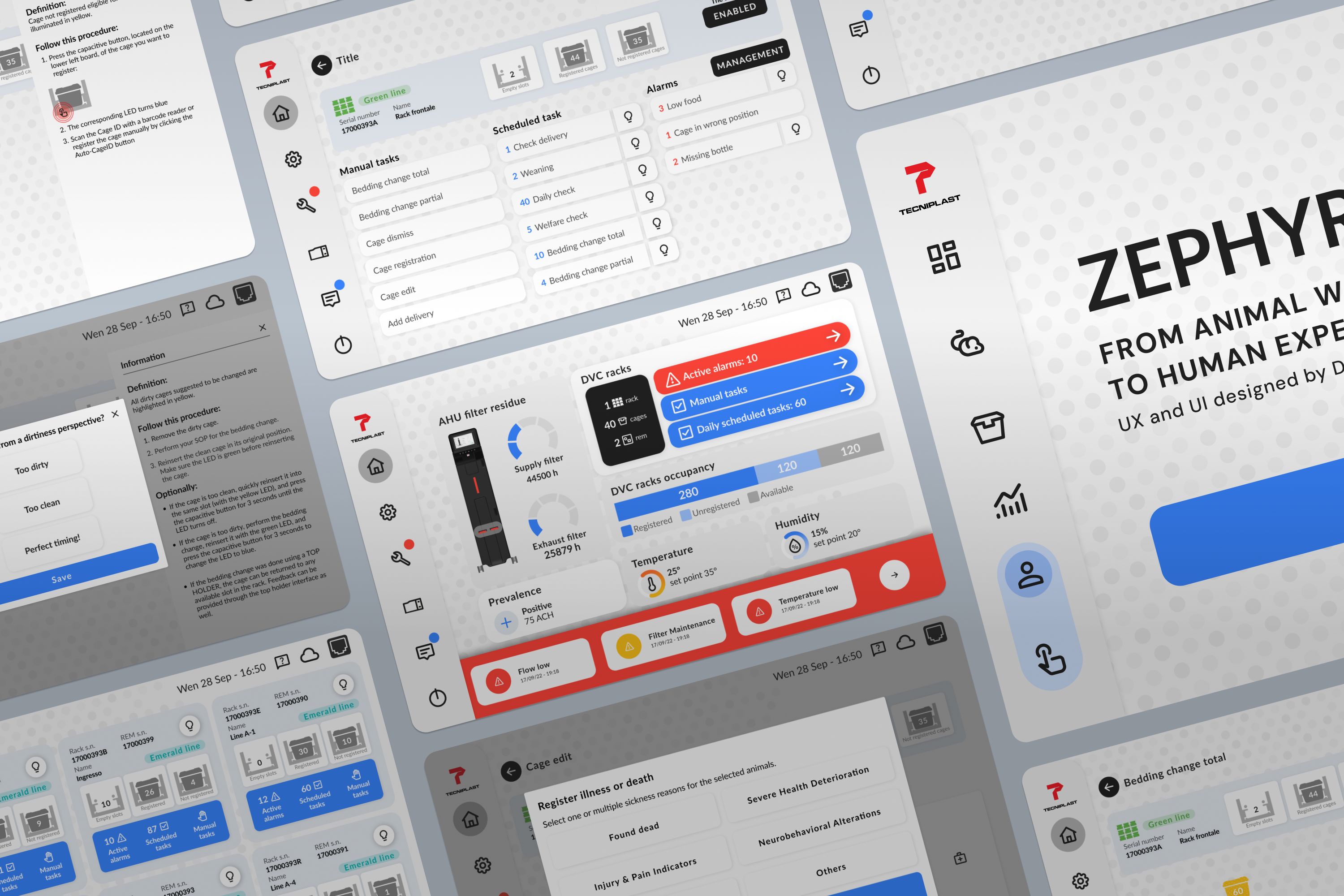 Having designed for contamination-controlled environments, I knew bringing a PC into a sterile area is a major constraint. From the start, I assumed PC use for ACTs should be minimal, not an easy task when you manage the workflows of 500 cages. While working on Top Holder's UI, a developer asked: “If the display is still 7'', how are you fitting more content? It feels like your UI has twice the space.” We realized that was precisely the constraint we had missed. The intuition was confirmed in Groningen: an operator was collecting cages' tags to speed up data entry. That defined Zephyr's vision: a phygital experience merging GUI and TUI. It challenged the team, but paid off: Zephyr was showcased at AALAS in November.